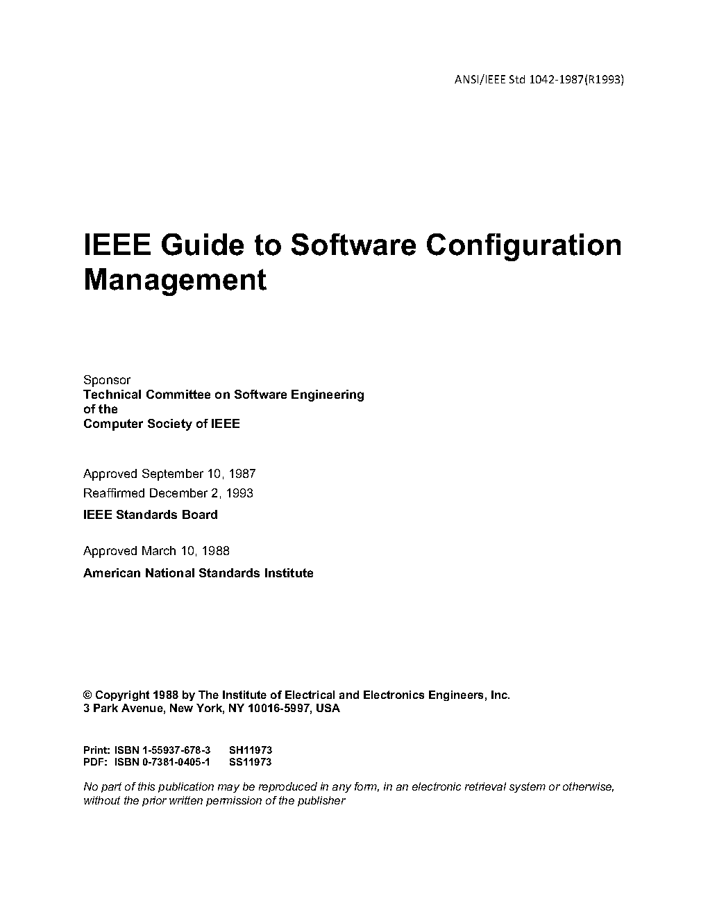 This guide describes the application of configuration management (CM) disciplines to the management of software engineering projects. Software configuration management (SCM) consists of two major aspects planning and implementation. For those planning SCM activities, this guide provides insight into the various factors that must be considered. Users implementing SCM disciplines will find suggestions and detailed examples of plans in this guide. This guide also presents an interpretation of how ANSI/IEEE Std 828-1983 [2] can be used for planning the management of different kinds of computer program development and maintenance activities. The guide is presented in two parts. The first part, the main body of the guide, presents issues to consider when planning software configuration management for a project or organization. The second part of the guide presents, for those preparing SCM Plans, a series of sample Plans illustrating different concepts discussed in the body of the guide. The text of the guide introduces the essential concepts of SCM, particularly those of special significance (for example, libraries and tools) to software engineering. It then presents the planning for SCM in terms of documenting a Plan following the outline of ANSI/IEEE Std 828-1983 [2] so that a user who is unfamiliar with the disciplines of software configuration management can gain some insight into the issues. For those preparing SCM Plans, the second part of the guide provides sample plans for consideration. The sample SCM Plans include a variety of software configuration management applications for different types of projects and organizations. illustrates a software configuration management plan (SCMP) for a project developing a complex, critical computer system. It describes a Plan for managing a typical software development cycle where the development is contracted to an organization that does not have responsibility for its maintenance or use. illustrates a SCMP for a small software development project. It describes a Plan for supporting a prototype development activity where the goal of the project is to demonstrate the feasibility of a concept. illustrates a SCMP used by an organization where the emphasis is on maintaining programs developed by other activities or organizations. illustrates a SCMP for an organization developing and maintaining computer programs embedded in a hardware product line. It describes a Plan for managing both software development and maintenance of a commercial product line. Some of the different characteristics illustrated are shown in Table 1 .