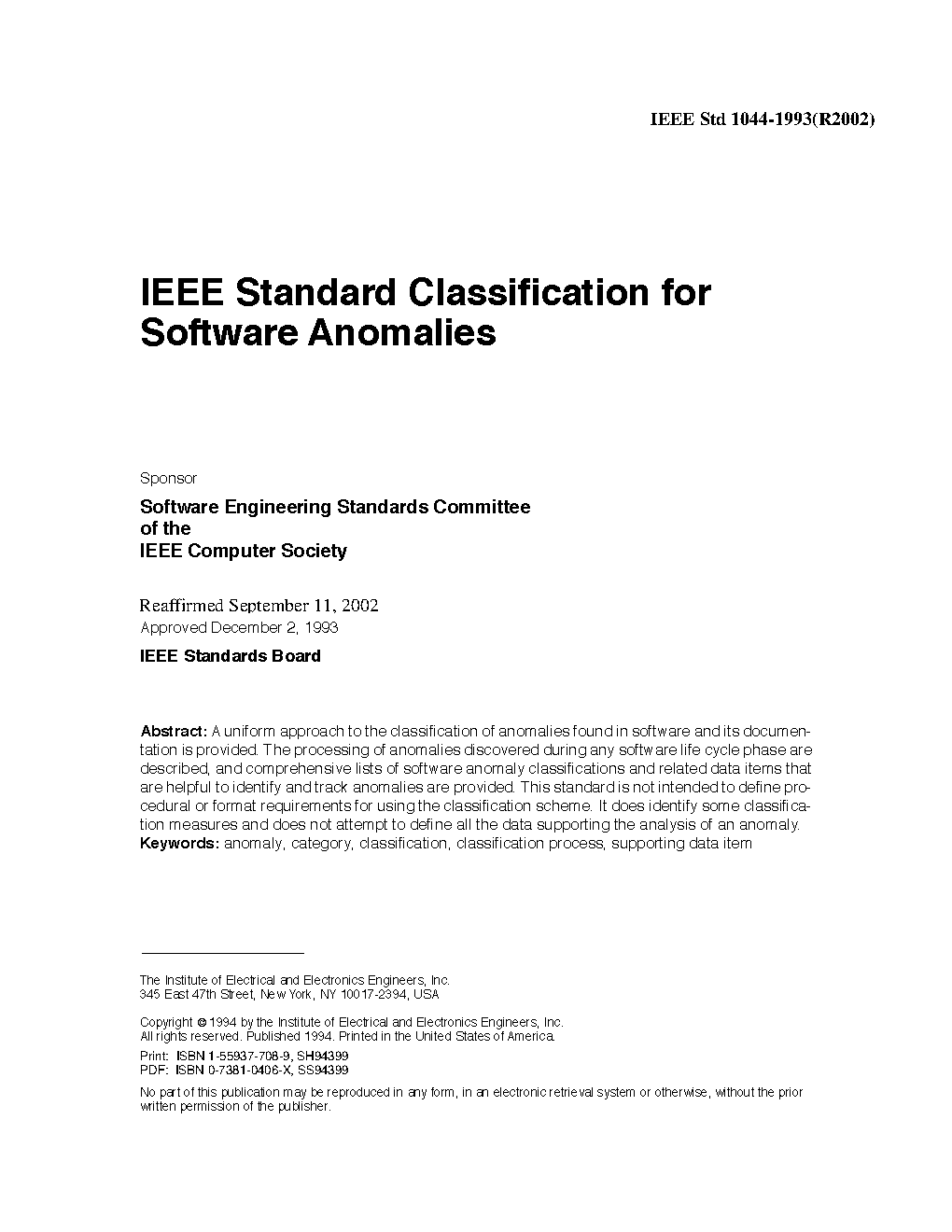 This standard provides a uniform approach to the classification of software anomalies, regardless of when they originate or when they are encountered within the project, product, or system lifecycle. Classification data can be used for a variety of purposes, including defect causal analysis, project management, and software process improvement (e.g., to reduce the likelihood of defect insertion and/or increase the likelihood of early defect detection).