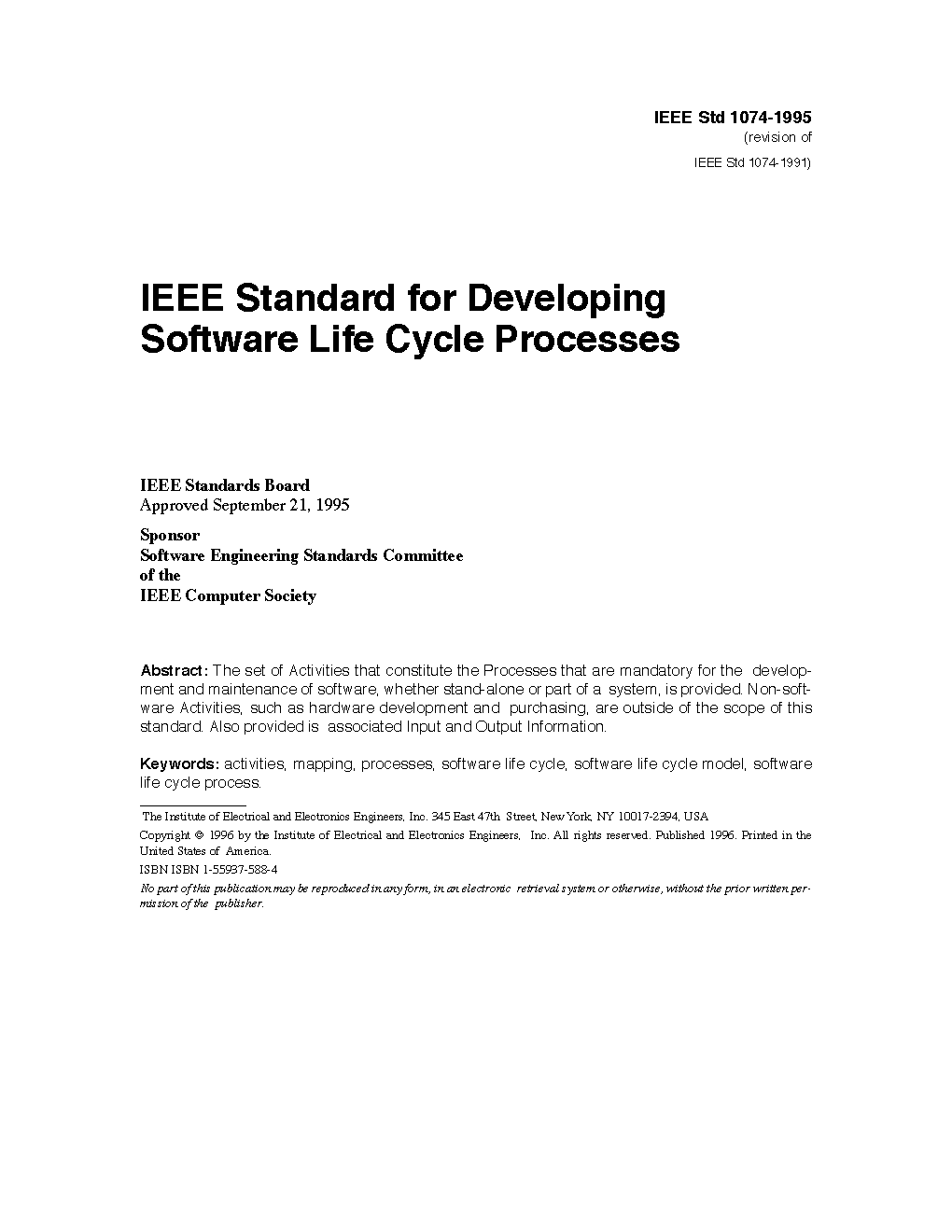 Superseded by 1074-1997. The set of Activities that constitute the Processes that are mandatory for the development and maintenance of software, whether stand-alone or part of a system, is provided. Non-software Activities, such as hardware development and purchasing, are outside of the scope of this standard. Also provided is associated Input and Output Information.
