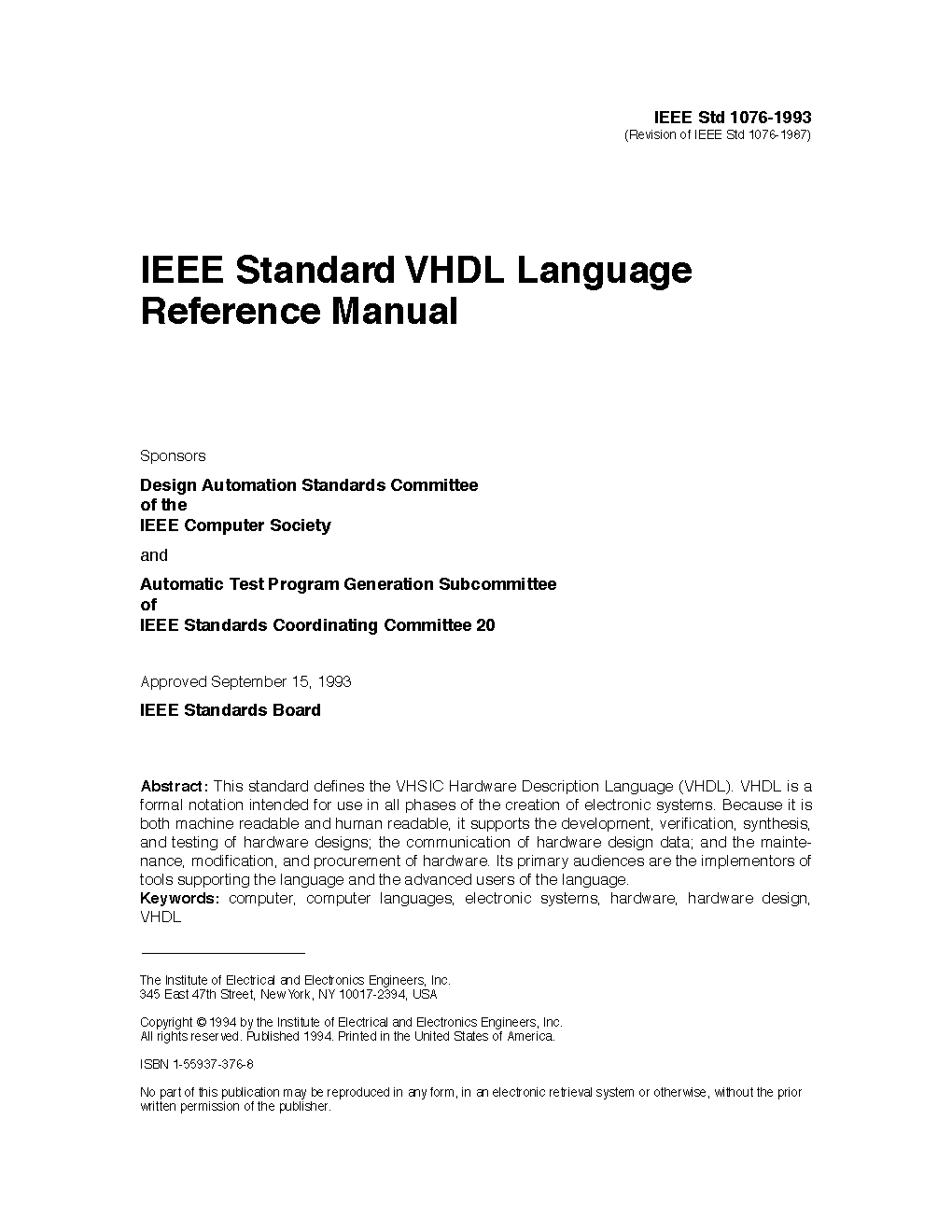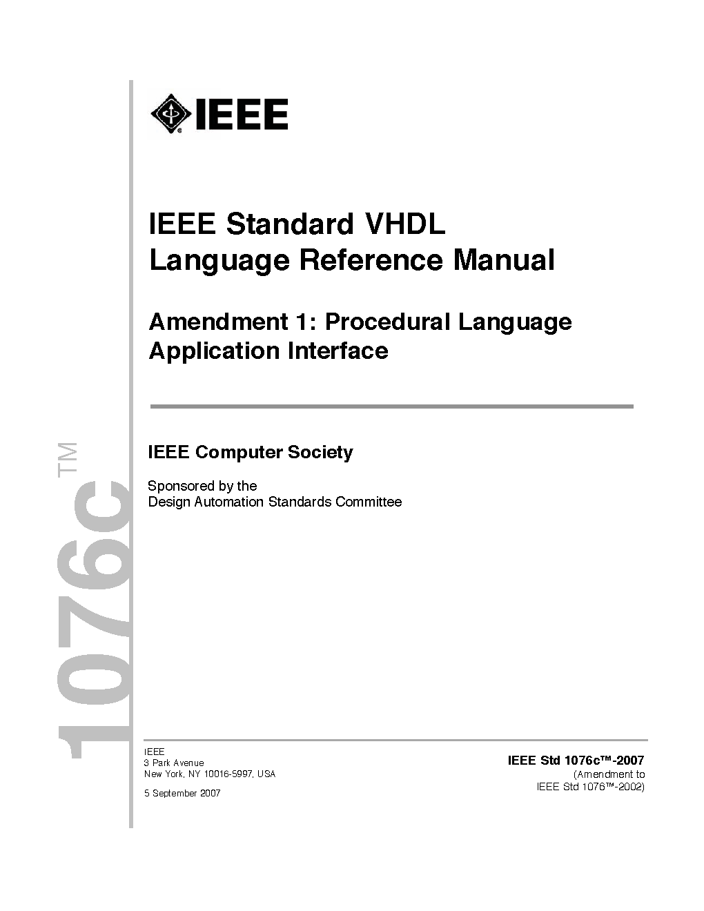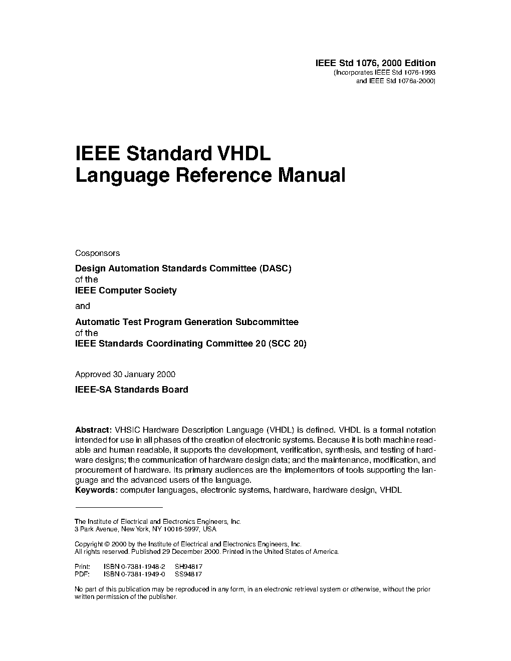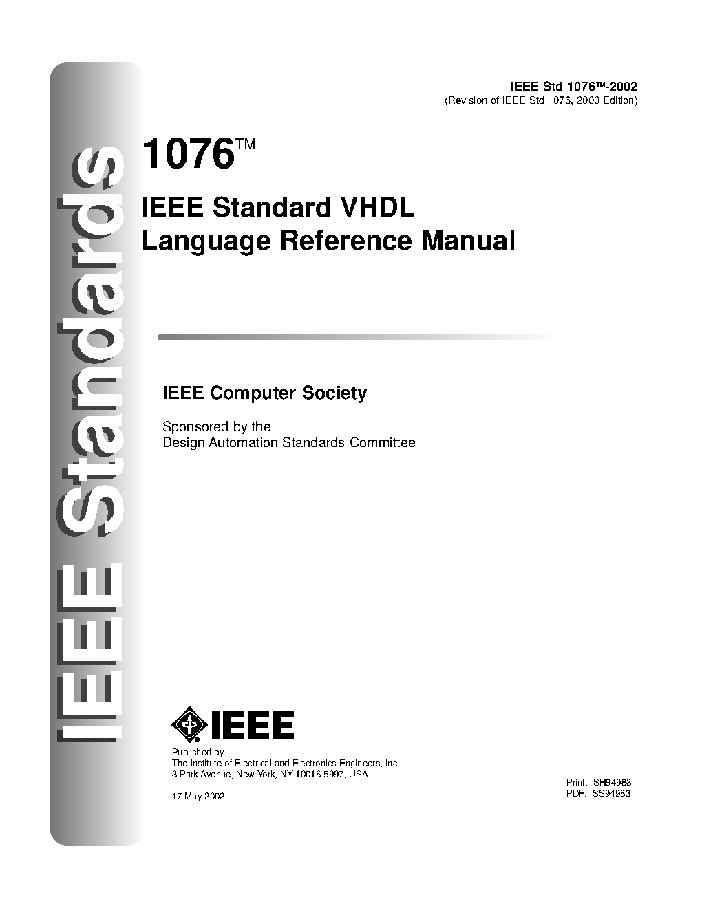 VHSIC Hardware Description Language (VHDL) is defined. VHDL is a formal notation intended for use in all phases of the creation of electronic systems. Because it is both machine readable and human readable, it supports the development, verification, synthesis, and testing of hardware designs; the communication of hardware design data; and the maintenance, modification, and procurement of hardware. Its primary audiences are the implementors of tools supporting the language and the advanced users of the language. (Additional downloads are available for this standard at https://standards.ieee.org/content/dam/ieee-standards/standards/web/download/1076-2008_downloads.zip)