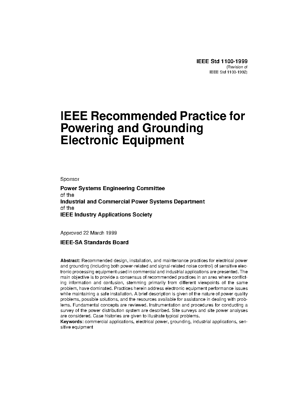 The main objective is to provide a consensus of recommended practices in an area where conflicting information and confusion, stemming primarily from different viewpoints of the same problem, have dominated. Practices herein address electronic equipment electrical performance and protection issues while maintaining a safe installation, as specified in the National Electrical Code(R) (NEC(R)) (NFPA 70, 2005 Edition) [B1]1 and recognized testing laboratories' standards. This recommended practice is not intended to replace or to take precedence over any codes or standards adopted by the jurisdiction where the installation resides.