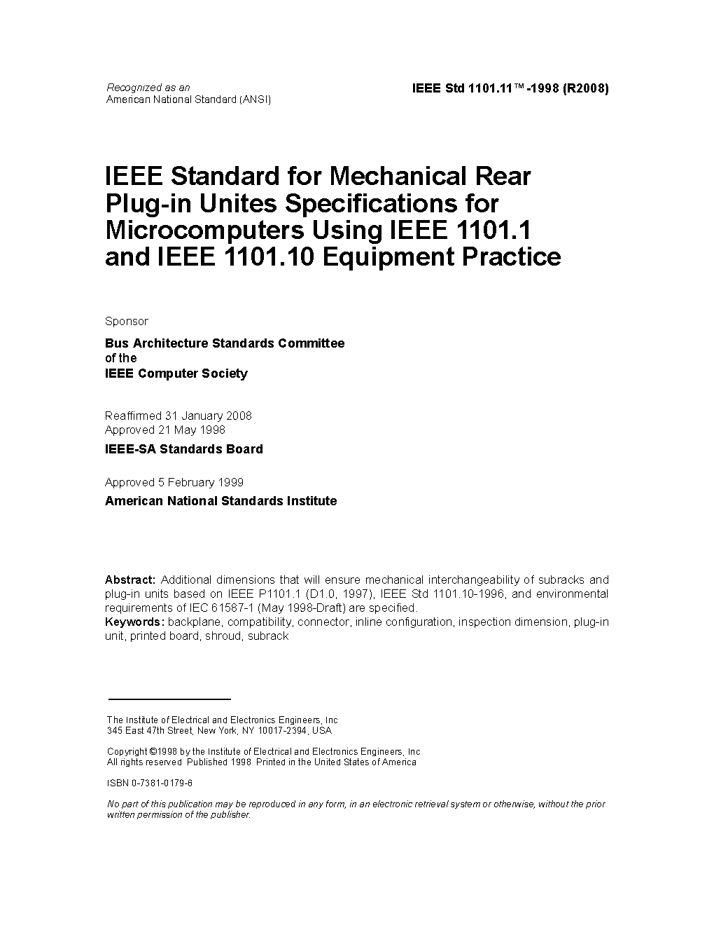 IEEE Standard for Mechanical Rear Plug-in Units Specifications for Microcomputers Using IEEE 1101.1 and IEEE 1101.10 Equipment Practice