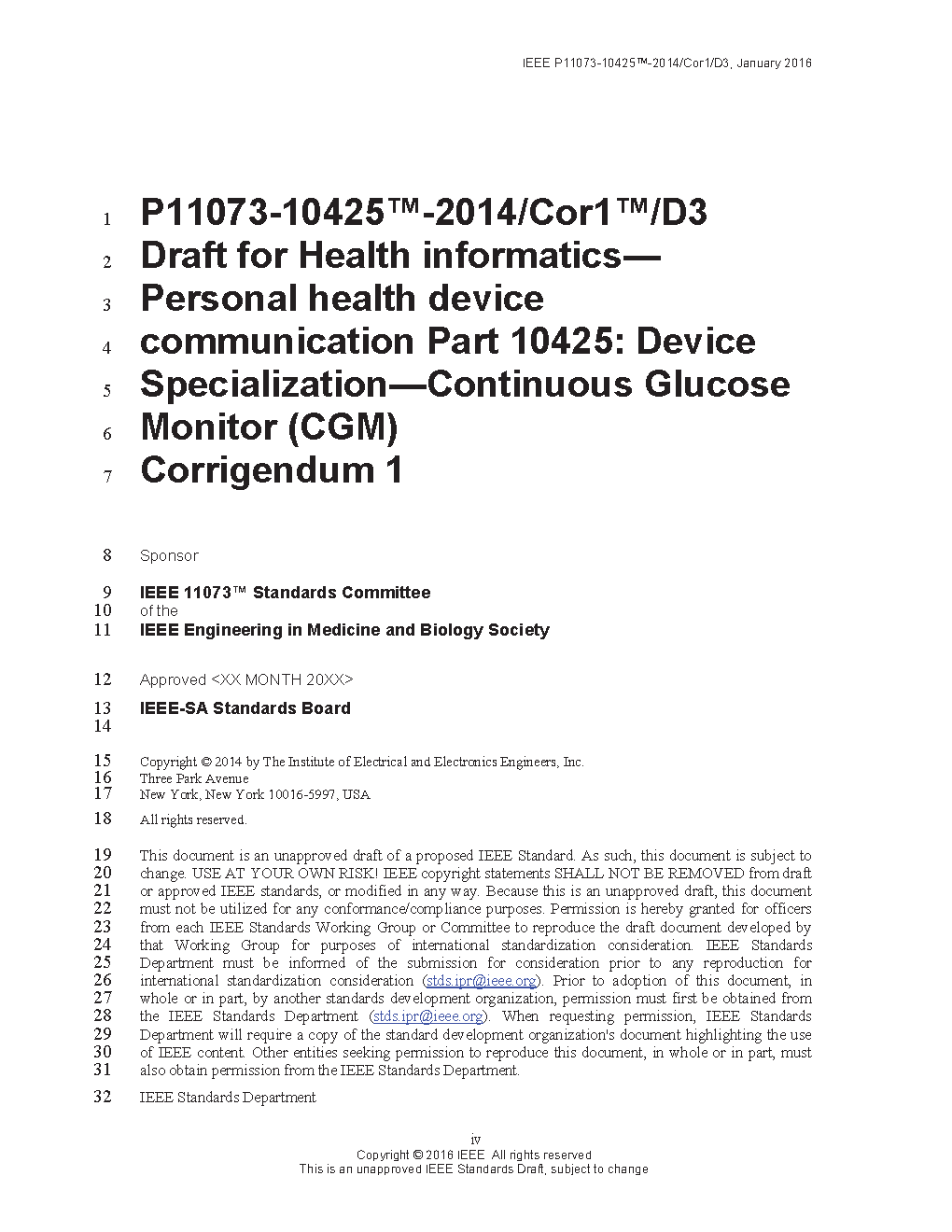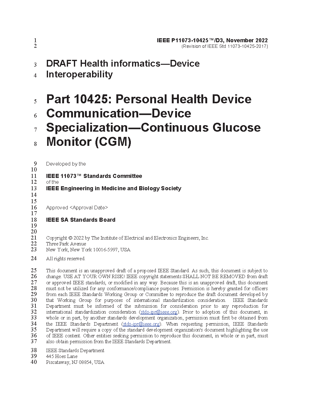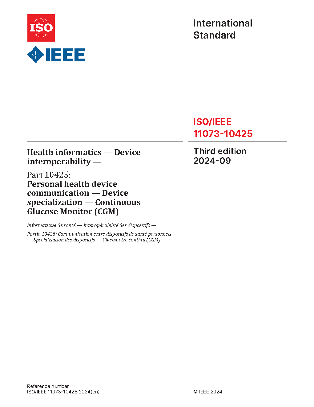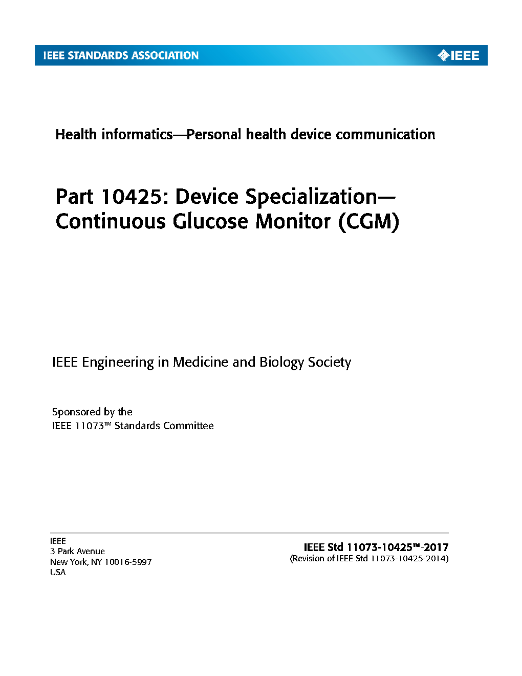 Within the context of the ISO/IEEE 11073 family of standards for device communication, a normative definition of the communication between continuous glucose monitor (CGM) devices and managers (e.g., cell phones, personal computers, personal health appliances, set top boxes), in a manner that enables plug-and-play interoperability, is established in this standard. It leverages appropriate portions of existing standards including ISO/IEEE 11073 terminology and information models. It specifies the use of specific term codes, formats, and behaviors in telehealth environments, restricting optionality in base frameworks in favor of interoperability. This standard defines a common core of communication functionality of CGM devices. In this context, CGM refers to the measurement of the level of glucose in the body on a regular (typically 5 minute) basis through a sensor continuously attached to the person.