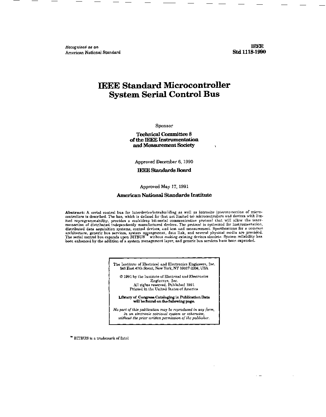 A serial control bus for interdevicehtrabuilding as well as intrasite interconnection of microcontrollers is described. The bus, which is defined for (but not limited to) microcontrollers and devices with limited reprogrammability, provides a multidrop bit-serial communication protocol that will allow the interconnection of distributed Independently manufactured devices. The protocol is optimized for instrumentation, distributed data acquisition systems, control devices, and test and measurement. Specifications for a common architecture, generic bus services, system wagement, data link, and several physical media are provided.