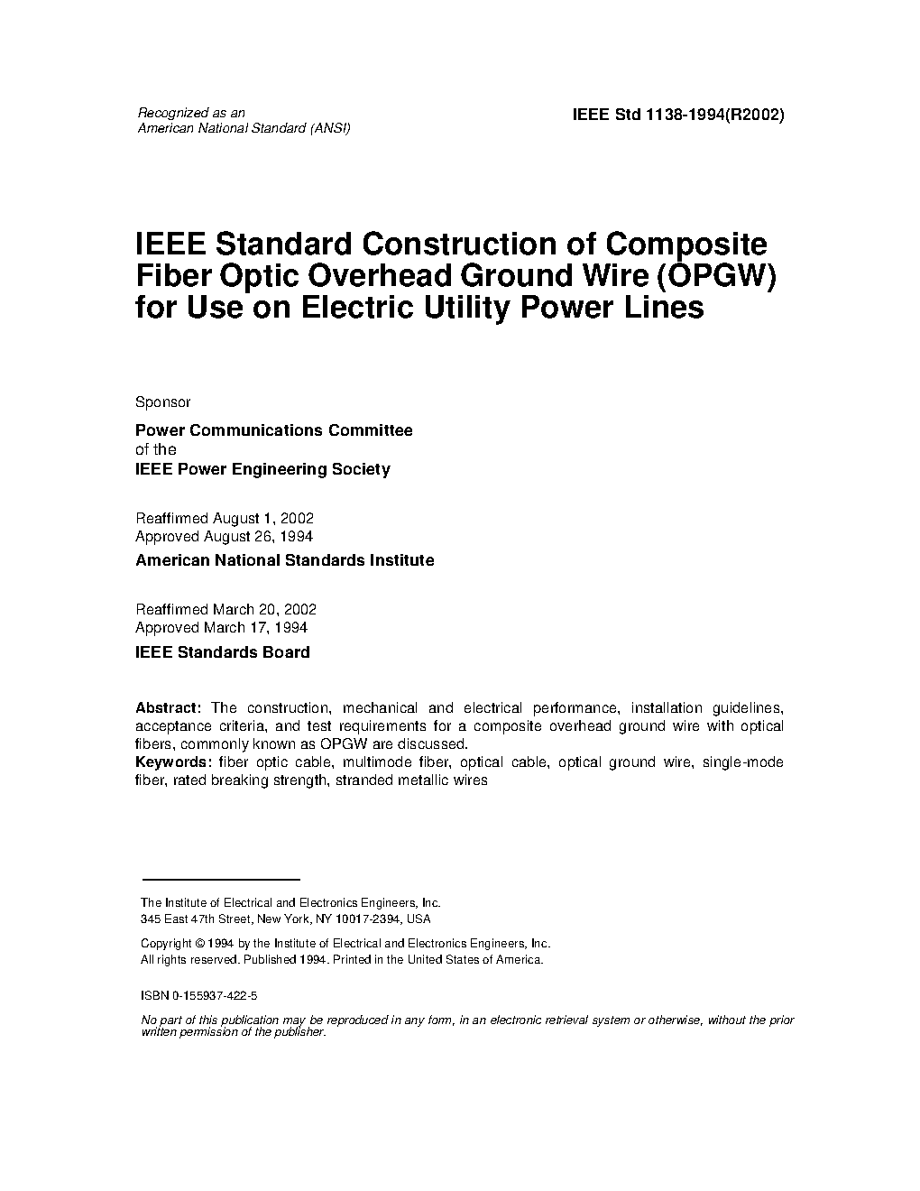 This standard covers the performance, test requirements, procedures, and acceptance criteria for a transmission line overhead ground wire (a.k.a. shield wire, static wire, earth wire, skywire) with optical fibers commonly known as optical ground wire (OPGW). An OPGW cable has the dual performance functions of a ground wire with telecommunications capabilities. This standard includes functional requirements such as electrical, mechanical, optical fiber, environmental and packaging, and test requirements related to design, installation, in-service, maintenance, including routine tests. This standard is not intended to supersede any established safety rules, codes, regulations, or practices associated with the use of OPGW cables. It is the responsibility of the user of this standard to establish appropriate safety and health practices and to determine the applicability of regulatory limitations prior to use.