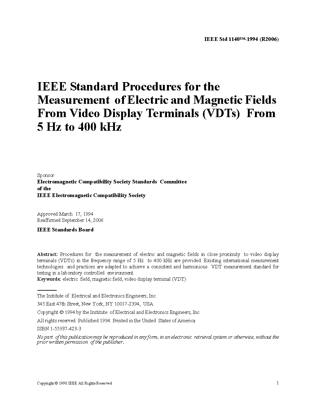 IEEE Standard Procedures for the Measurement of Electric and Magnetic Fields from Video Display Terminals (VDTs) from 5 Hz to 400 kHz