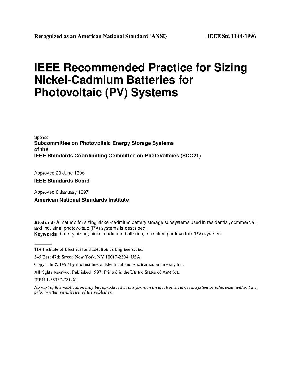 This recommended practice is meant to assist system designers in siziing nickel/cadmium batteries for residential, commercial, and industrial PV systems.