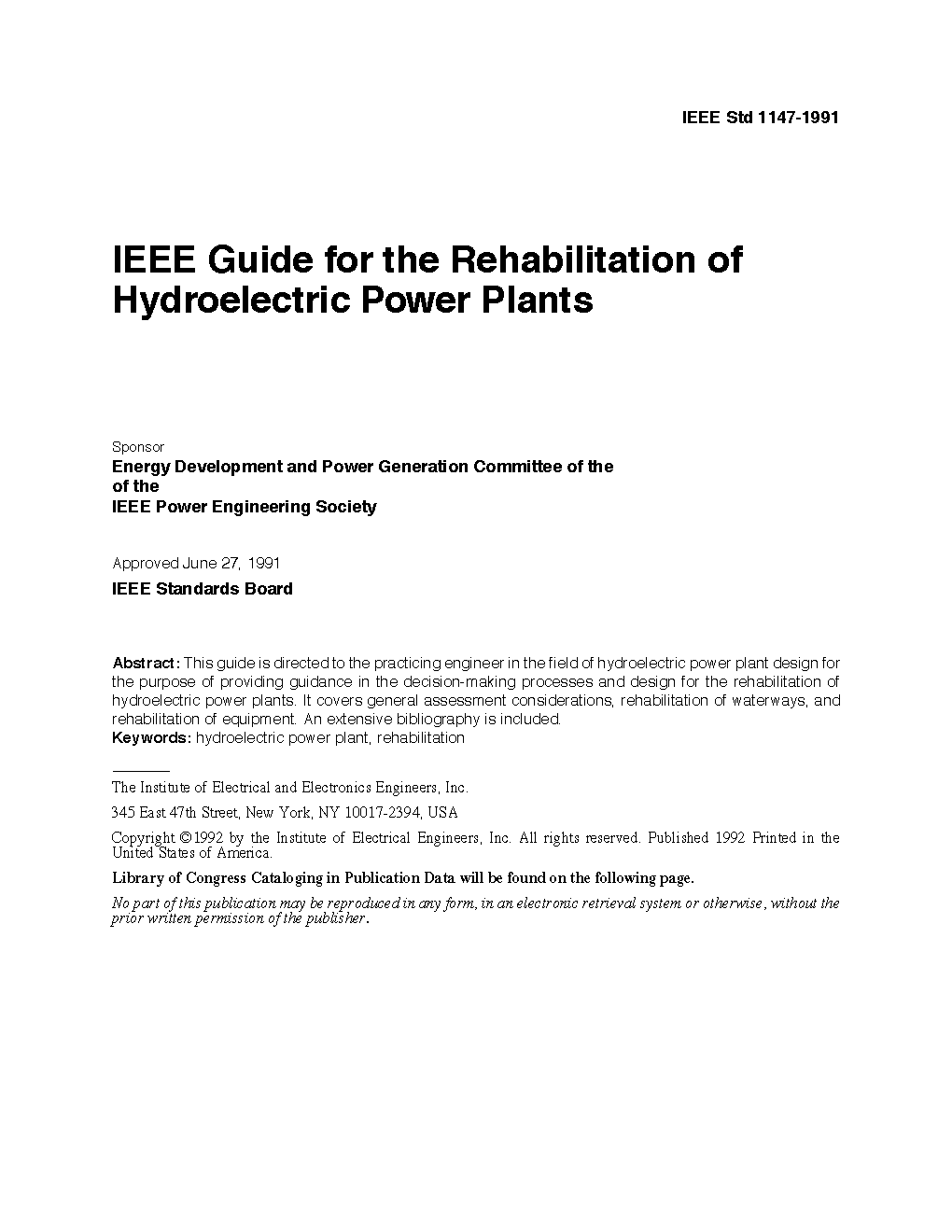 Reaffirmed March 2012. This guide is intended for the hydroelectric power industry to assist hydroelectric power plant owners, operators, and designers in the economic (feasibility) and technical evaluation (electrical aspects) of existing hydroelectric installations for rehabilitation. It addresses conventional hydropower. Portions of this guide are relevant to pumped storage but the unique features of pumped storage are not covered. Feasibility study results may indicate redevelopment of the site. Redevelopment will not be treated in detail in this guide. This guide covers all generating equipment up to and including the main transformer and typical auxiliary equipment.
