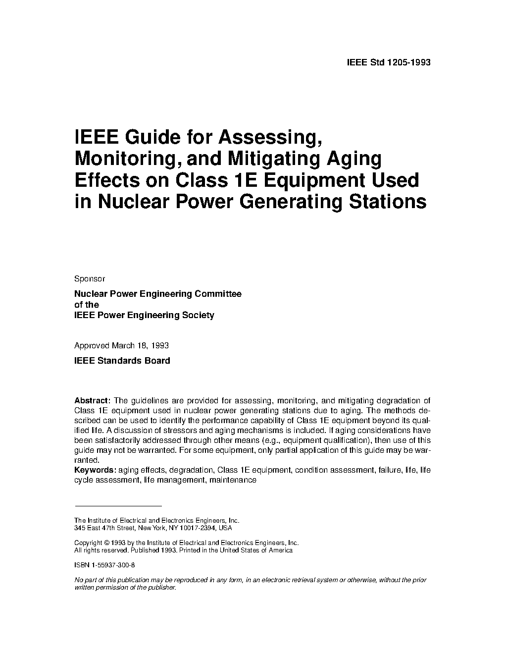 This document provides the guidelines for assessing, monitoring, and mitigating aging degradation effects on class 1E equipment used in nuclear power generating stations.