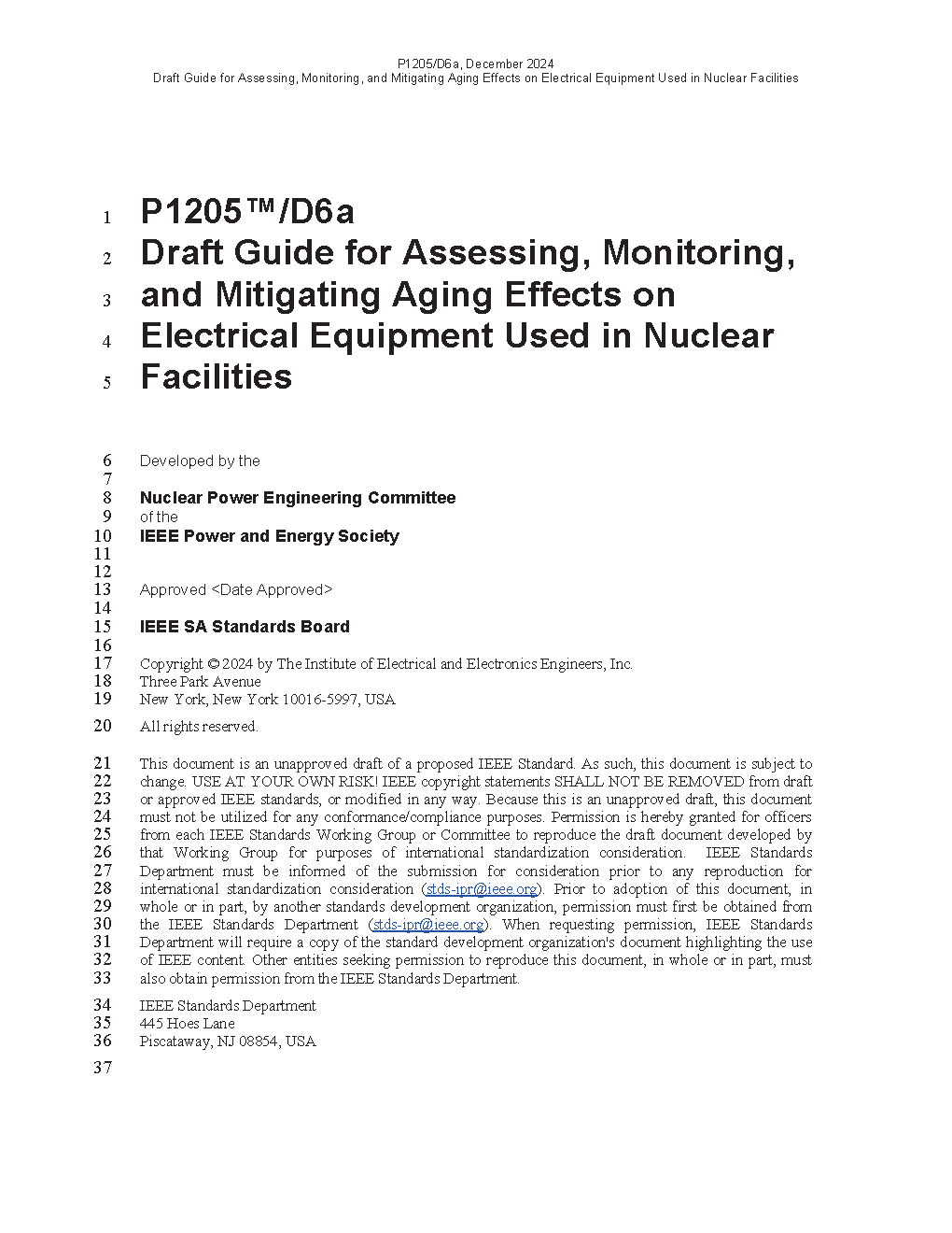 The purpose of this document is to supplement existing IEEE nuclear standards in assessing aging degradation effects. The methods described herein can be used to identify the performance capability of Class 1E equipment beyond its qualified life. The purpose of this revision is to incorporate feedback received from the industry to make the guide more useful and applicable to electrical equipment in nuclear generating stations and, as part of this effort, bring the approaches discussed in the guide into closer conformance with the present industry philosophy.