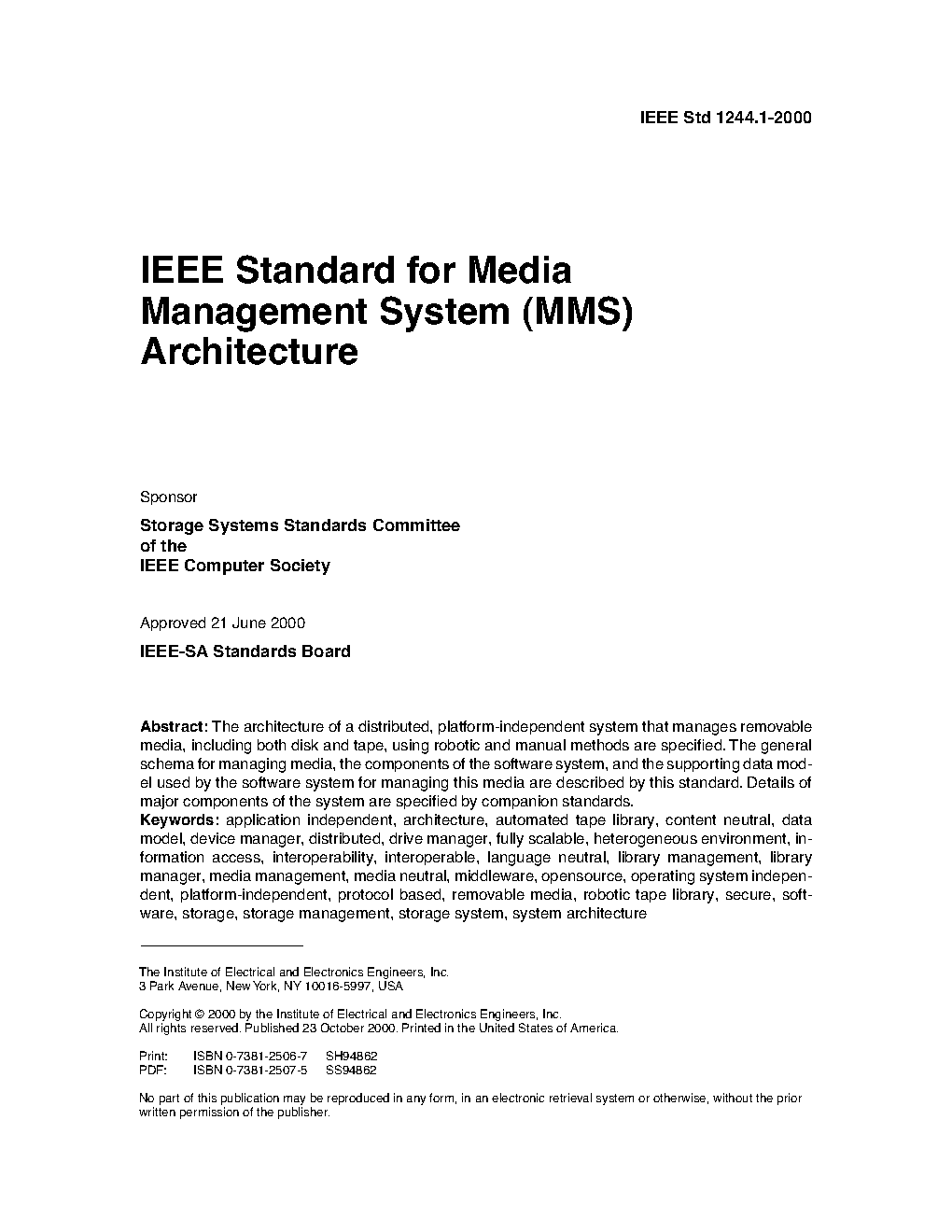 Administratively withdrawn January 2007 The architecture of a distributed, platform-independent system that manages removable media, including both disk and tape, using robotic and manual methods are specified. The generals chema for managing media, the components of the software system, and the supporting data model used by the software system for managing this media are described by this standard. Details of major components of the system are specified by companion standards.
