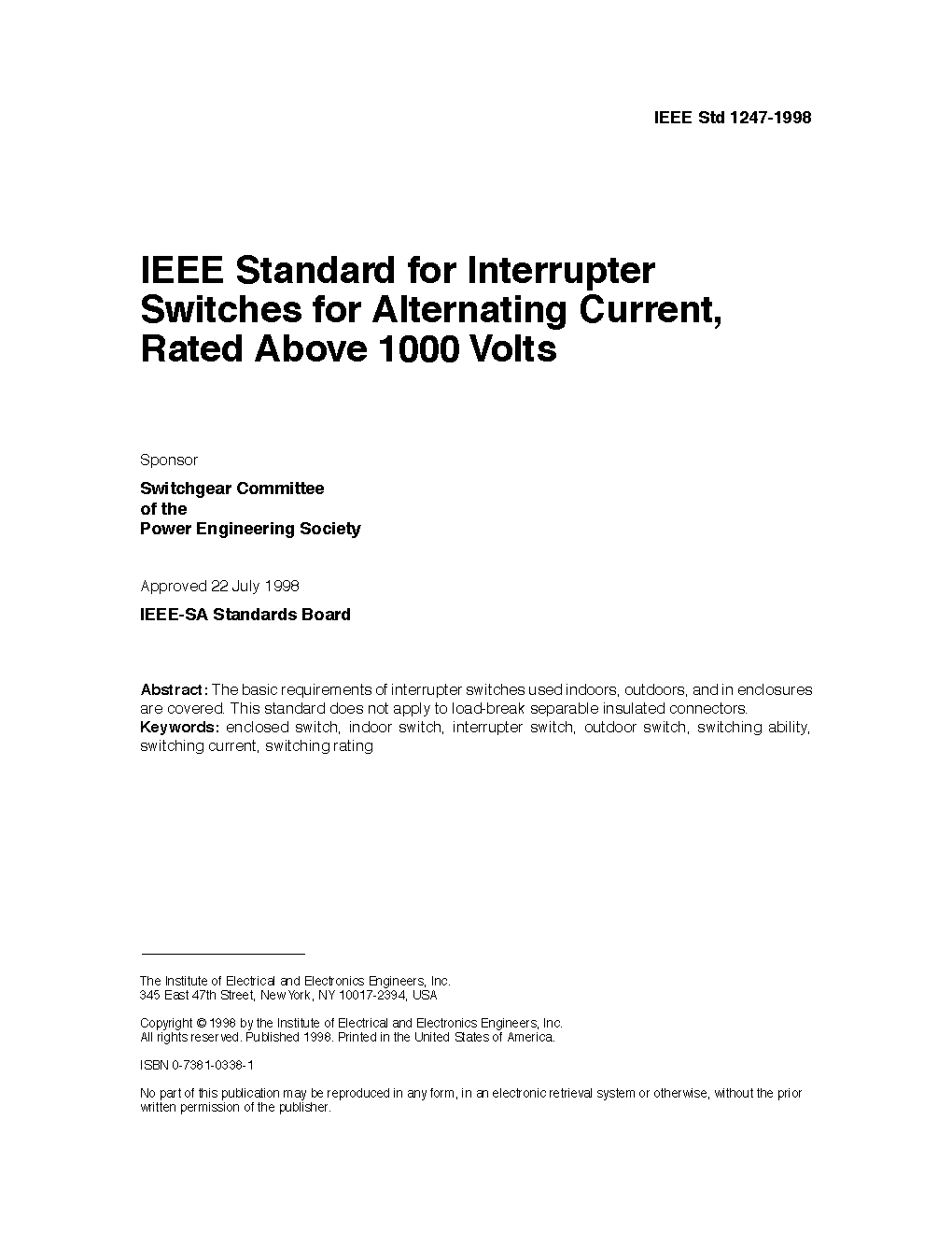 The basic requirements of interrupter switches used indoors, outdoors, and in enclosures are covered. This standard does not apply to load-break separable insulated connectors.