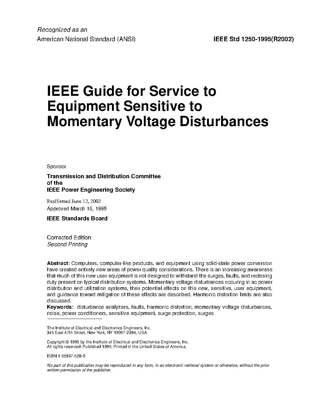 The primary purpose of this guide is to assist power delivery system designers and operators in delivering power with power quality that is compatible with electrical end-use equipment. Another purpose is to point utility system customers toward power quality solutions that may exist in the power utilization system and equipment.