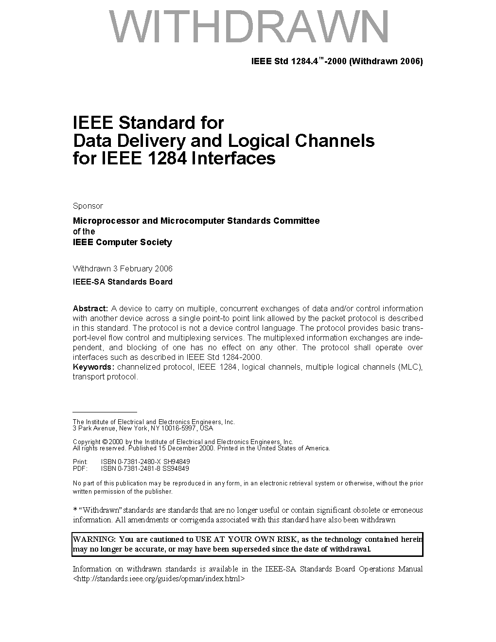 Administratively Withdrawn February 2006 A device to carry on multiple, concurrent exchanges of data and/or control informationwith another device across a single point-to-point link allowed by the packet protocol is describedin this standard. The protocol is not a device control language. The protocol provides basictransport-level flow control and multiplexing services. The multiplexed information exchanges areindependent, and blocking of one has no effect on any otherre. The protocol shall operate over inter-faces such as described in IEEE Std 1284-2000.