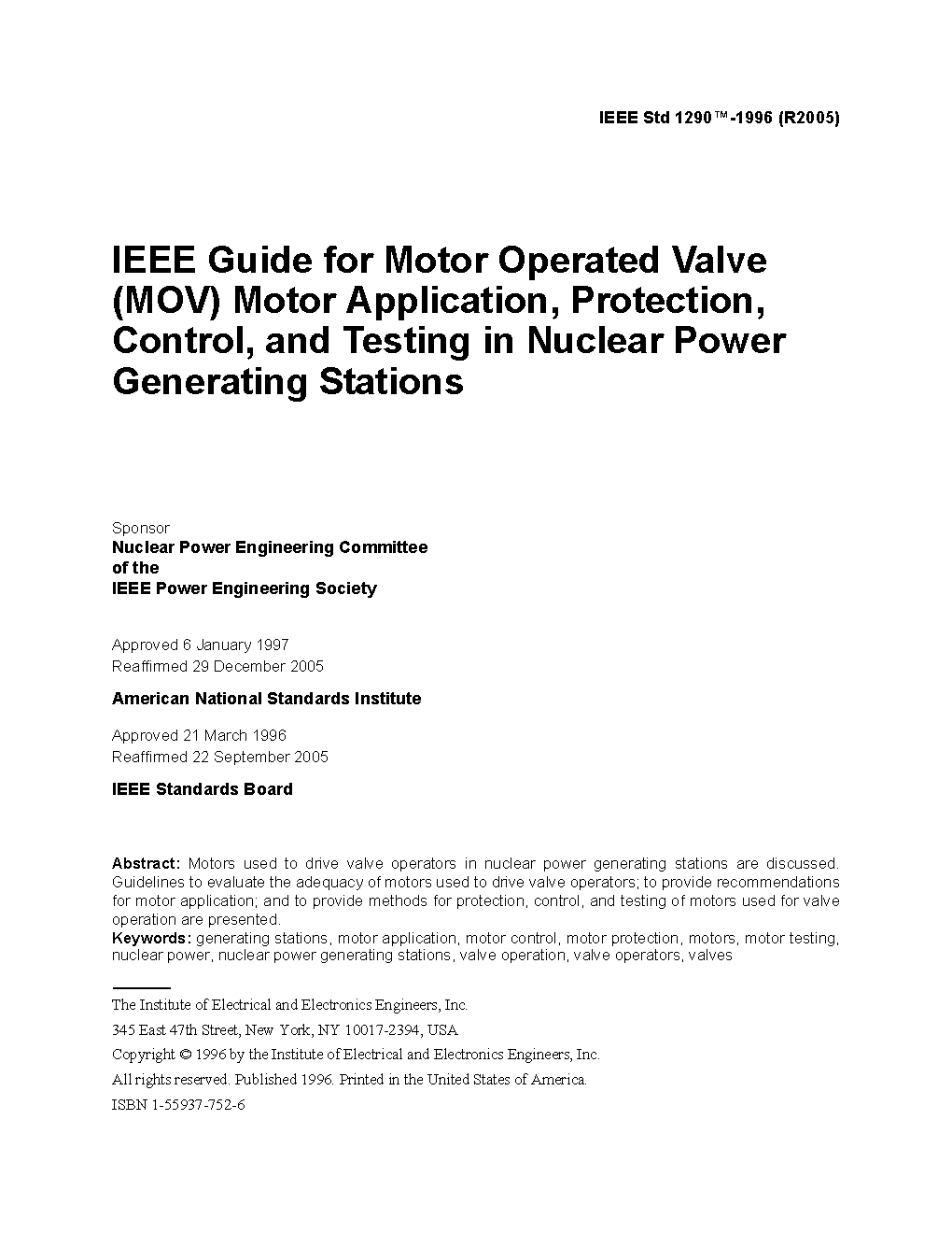 This guide presents guidelines to evaluate the adequacy of motors used to drive valve operators; to provide recommendations for motor application; and to provide methods for protection, control, and testing of motors used for valve operation.