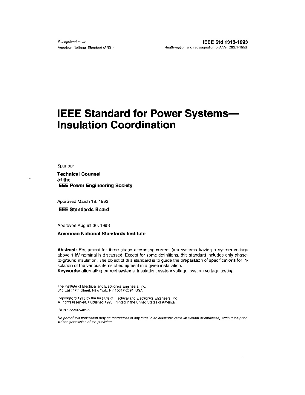 This standard applies to three-phase ac systems above 1 kV. It specifies the procedure for selection of the withstand voltages for equipment phase-to-earth and phase-to-insulation systems. It also identifies a list of standard insulation levels. This standard recommends that the selected insulation level should be based on the voltage stress to which the equipment is being exposed. Insulation coordination studies usually identify overvoltages in per unit of the crest nominal or maximum system voltage to ground. Although the principles of this standard also apply to transmission line insultation systems, the insulation levels may be different from those identified as standard insulation levels.
