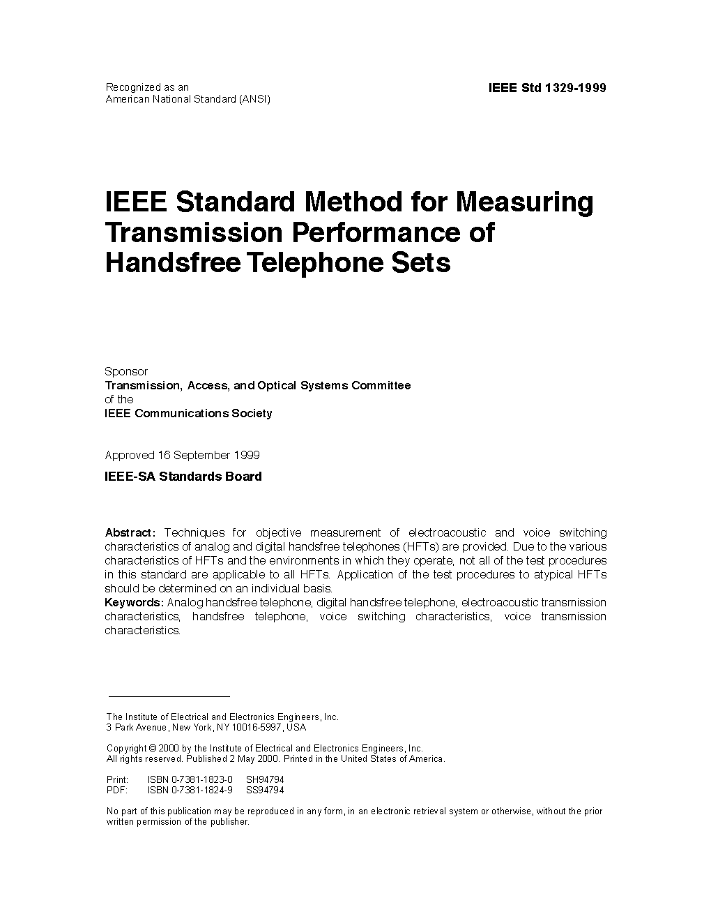 The purpose of this standard is to provide practical methods for making laboratory measurements of the transmission and voice-switching characteristics of speakerphones so that their performance may be evaluated on a standardized basis.
