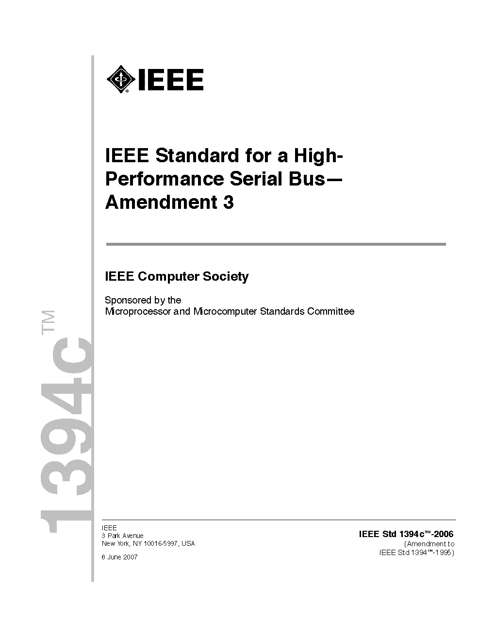 This standard incorporates the contents of IEEE Std 1394™-1995 as revised by IEEE Std 1394a™-2000, IEEE Std 1394b™-2002, and IEEE Std 1394c™-2006. In addition, over 100 errata have been corrected, and several new features have been added per Q.12.