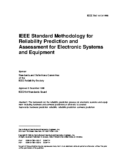 The purpose of this standard is to identify the required elements for an understandable and useful reliability prediction. A reliability prediction made according to this standard shall have sufficient information concerning inputs, assumptions, and uncertainty so the risk associated with using the prediction results can be understood.