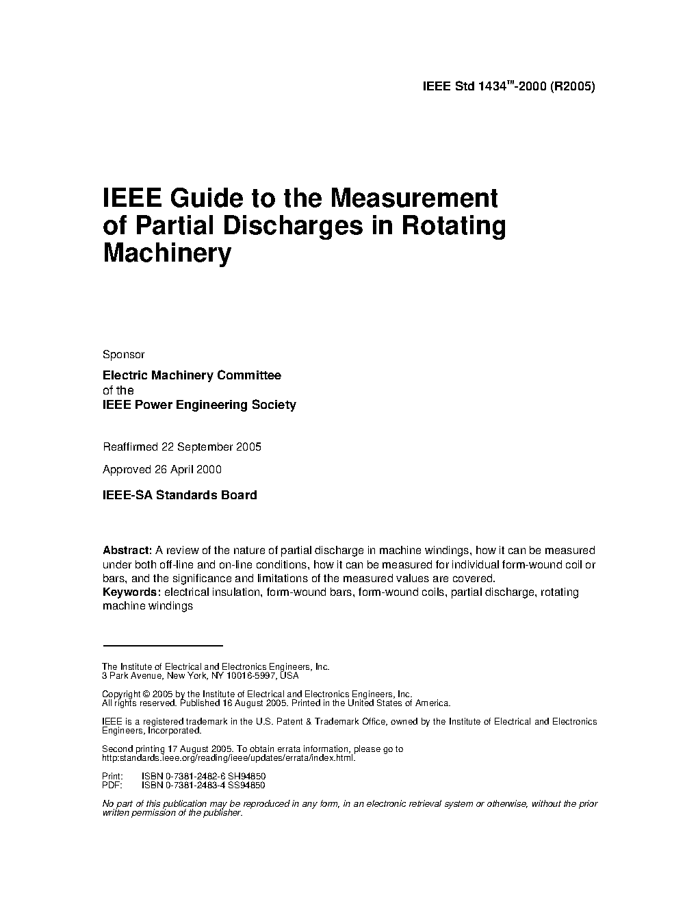 A review of the nature of partial discharge in machine windings, how it can be measured under both off-line and on-line conditions, how it can be measured for individual form wound coils or bars, and the significance and limitations of the measured values are covered in this standard.
