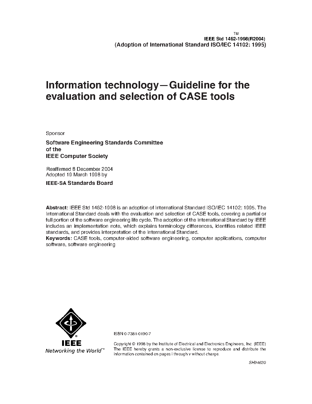IEEE Adoption of ISO/IEC 14102:1995 Information Technology - Guideline for the Evaluation and Selection of CASE Tools