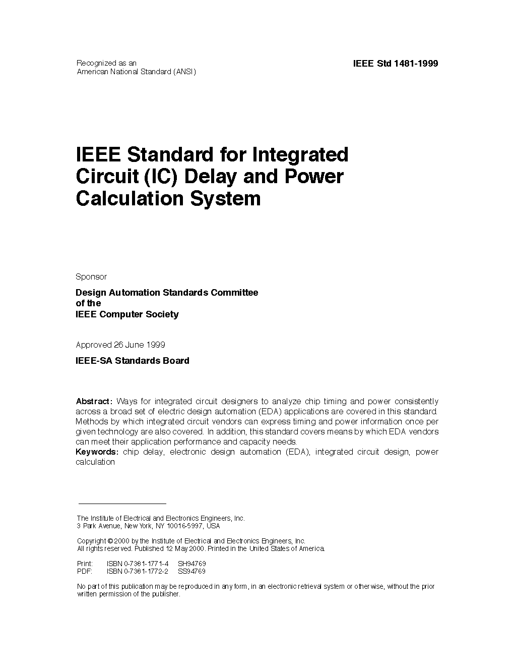 To improve the IEEE Std 1481(TM)-1999 system for integrated circuit designers to more accurately and more completely analyze semiconductor designs across EDA applications and for integrated circuit vendors to express logical behavior, signal integrity, delay, and power information only once per technology while enabling sufficient EDA application accuracy.