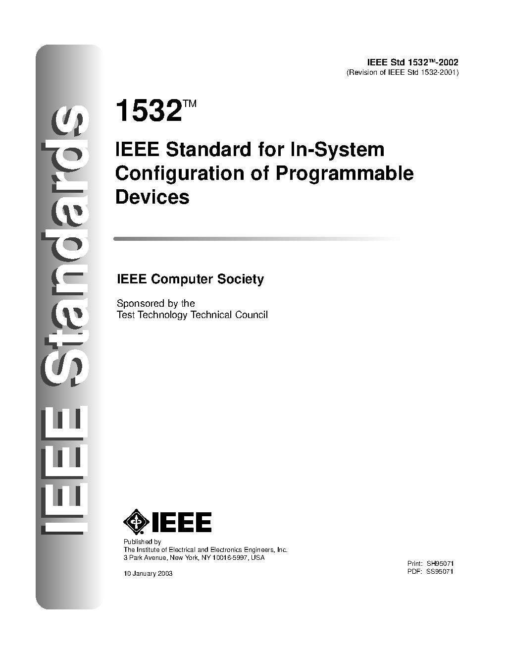 The communication protocol described by IEEE Std 1149.1 TM -2001 (Standard Test Access Port and Boundary-Scan Architecture) has been adopted by this standard for providing standardized programming access and methodology for programmable integrated circuit devices.Devices that implement this standard will first be compliant with IEEE Std 1149.1-2001, which isused for testing purposes. A device, or set of devices, implementing this standard can be pro-grammed (written), read back, erased, and verified, singly or concurrently, with a standardized setof resources. Sample implementation and application details (which are not part of this standard)are included for illustrative purposes.