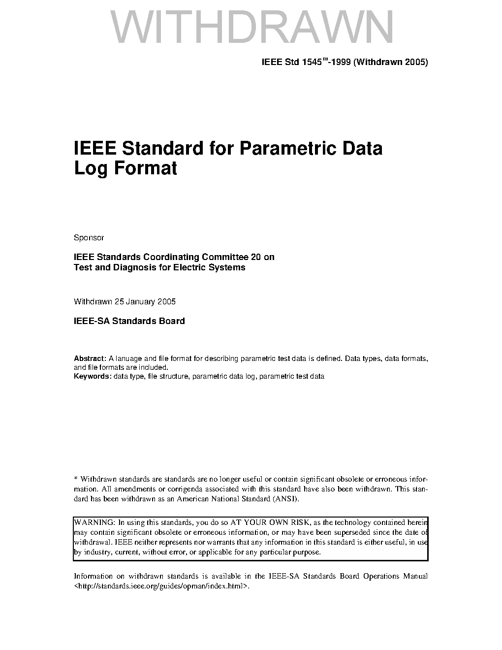Jan 2005: Administratively withdrawn. A language and file format for describing parametric test data is defined. Data types, dataformats, and file formats are included.