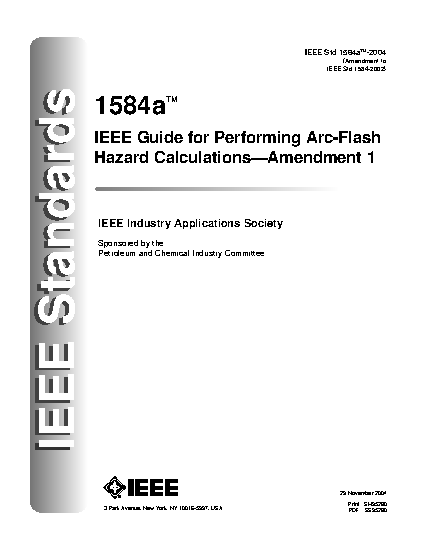 This guide provides techniques for designers and facility operators to apply in determining the arc flash hazard distance and the incident energy to which employees could be exposed during their work on or near electrical equipment. Included are 2 Arc Flash Hazard Calculators and 3 Test Data files. Contact stds-help@ieee.org for these additional files. An interpretation is available at http://standards.ieee.org/reading/ieee/interp/1584-2002.html
