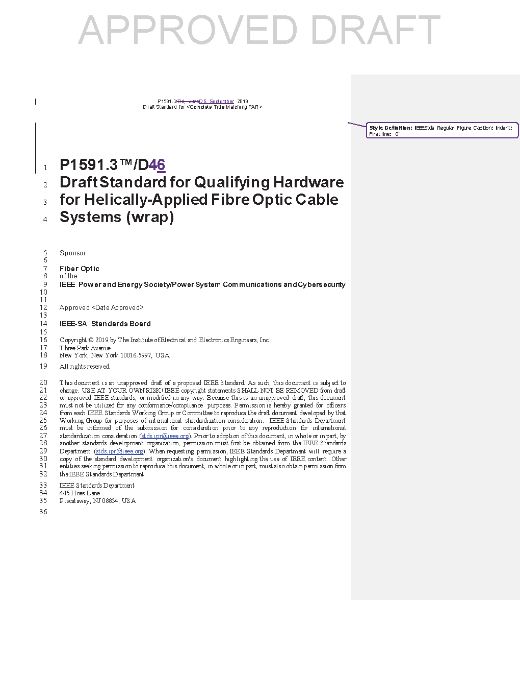 This standard covers hardware for use with all-dielectric fiber optic (WRAP) cable designed to be helically wrapped around a conductor or other messenger on overhead power facilities. This covers mechanical, and electrical performance, test requirements, environmental considerations, and acceptance criteria for qualification of the hardware.