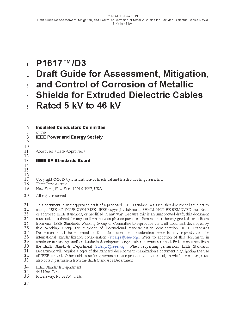 The purpose of this document is to provide guidance for the assessment, mitigation, and control of corrosion in metallic shield wires, straps, or tapes in both jacketed and unjacketed, medium voltage, extruded dielectric cables rated 5 kV to 46 kV.