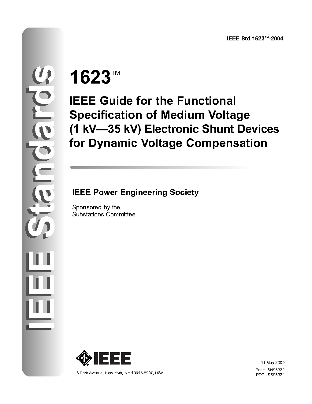 This document provides general guidelines on the preparation of a functional specification for a solid-state electronic shunt device used mainly to compensate for voltage fluctuation. The guide covers devices rated to medium voltage (1 kV to 35 kV). In general, these devices contain: a bidirectional converter, an energy storage device, and a coupling transformer connected in parallel. The guide also covers the following equipment to assure proper interface with the electric network including, but not limited to, voltage and current transformers, disconnect switches, circuit breakers, and three-phase low voltage service for auxiliary power.