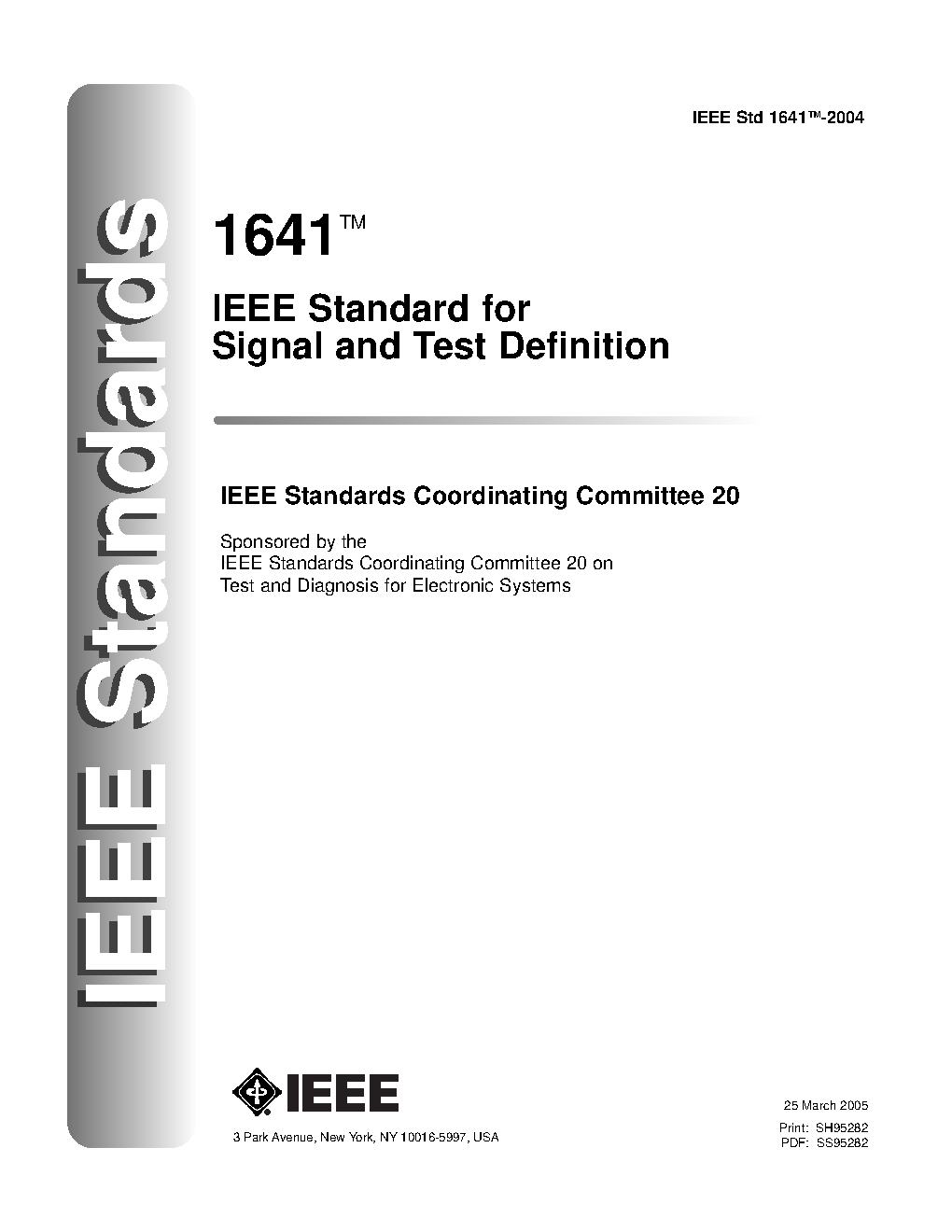 This standard provides the means to define and describe signals used in testing. It provides a set of common basic signal definitions, built upon formal mathematical specifications, so that signals can be combined to form complex signals usable across all test platforms. The standard provides support for structural textual languages and programming language interfaces for interoperability.