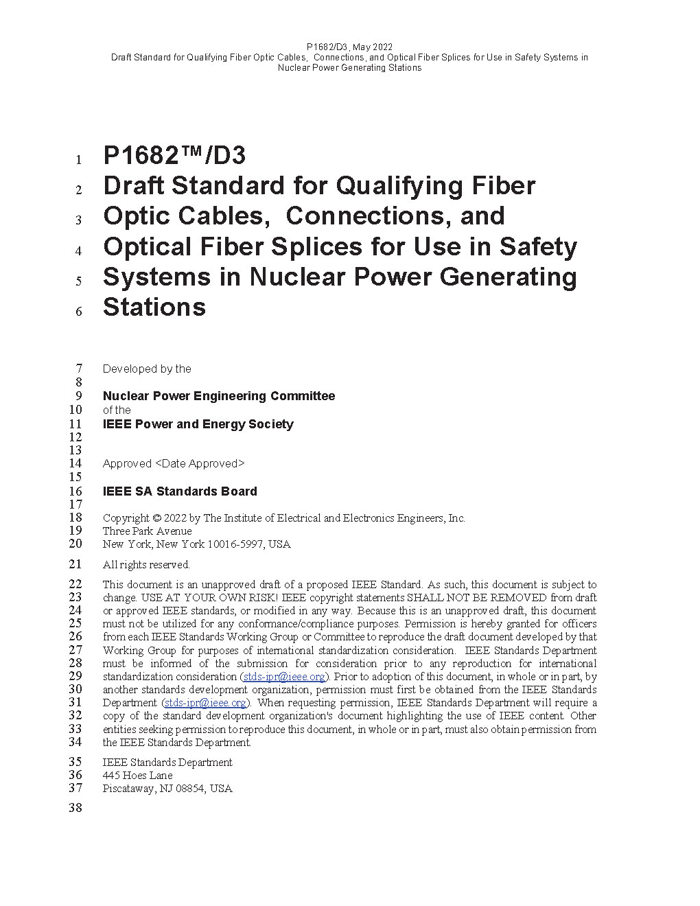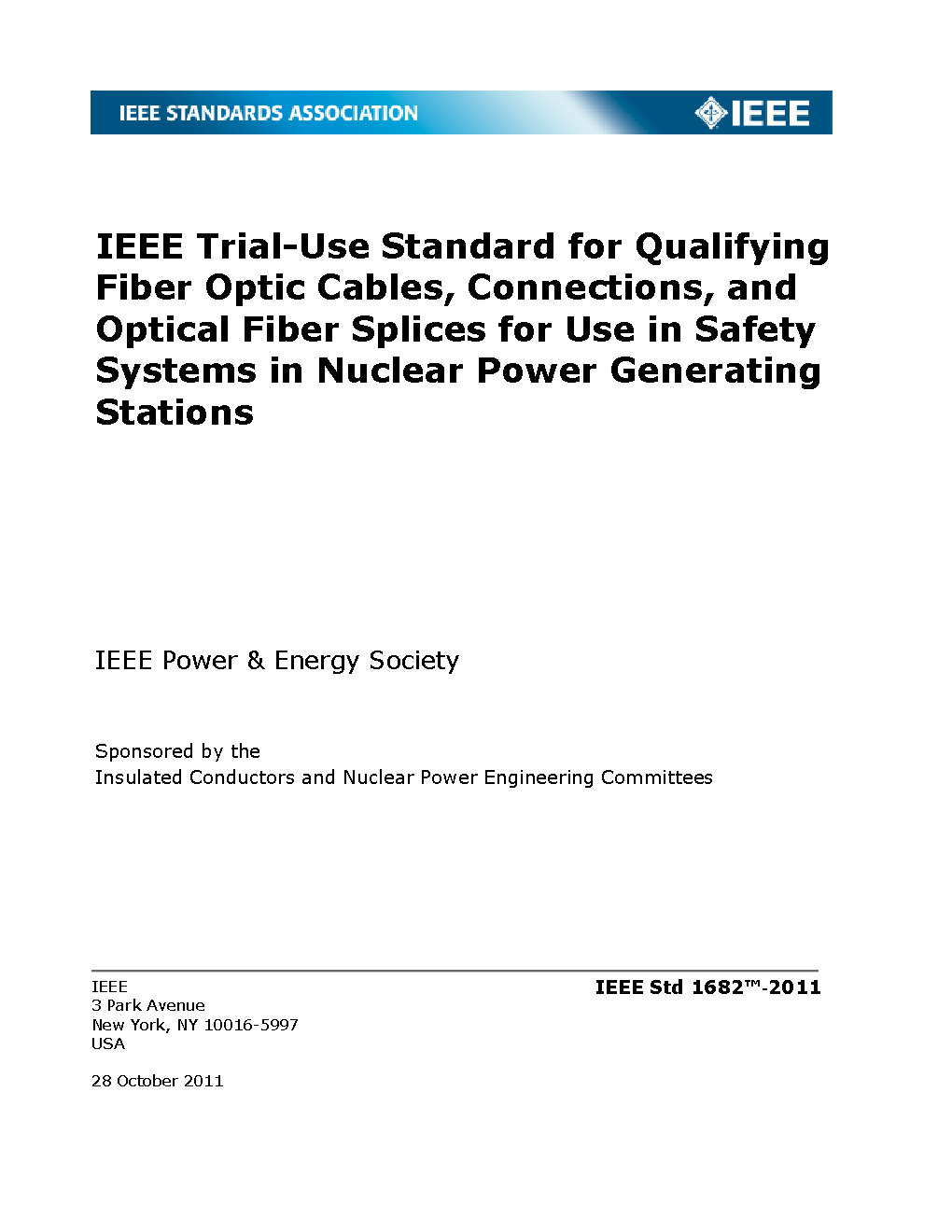 This standard provides requirements, directions, and methods for qualifying fiber optic cables, connections, and optical fiber splices for use in safety systems of nuclear power generating stations. Cables, connections, optical fibers, and splices within or integral to other devices (e.g., sensors, instruments, panels, etc.) shall be qualified using the requirements in the applicable device standard or IEEE Std 323TM-2003, as appropriate. However, this standard's requirements may be applied to the fiber optic cable, connections, and optical fiber splices within these devices.