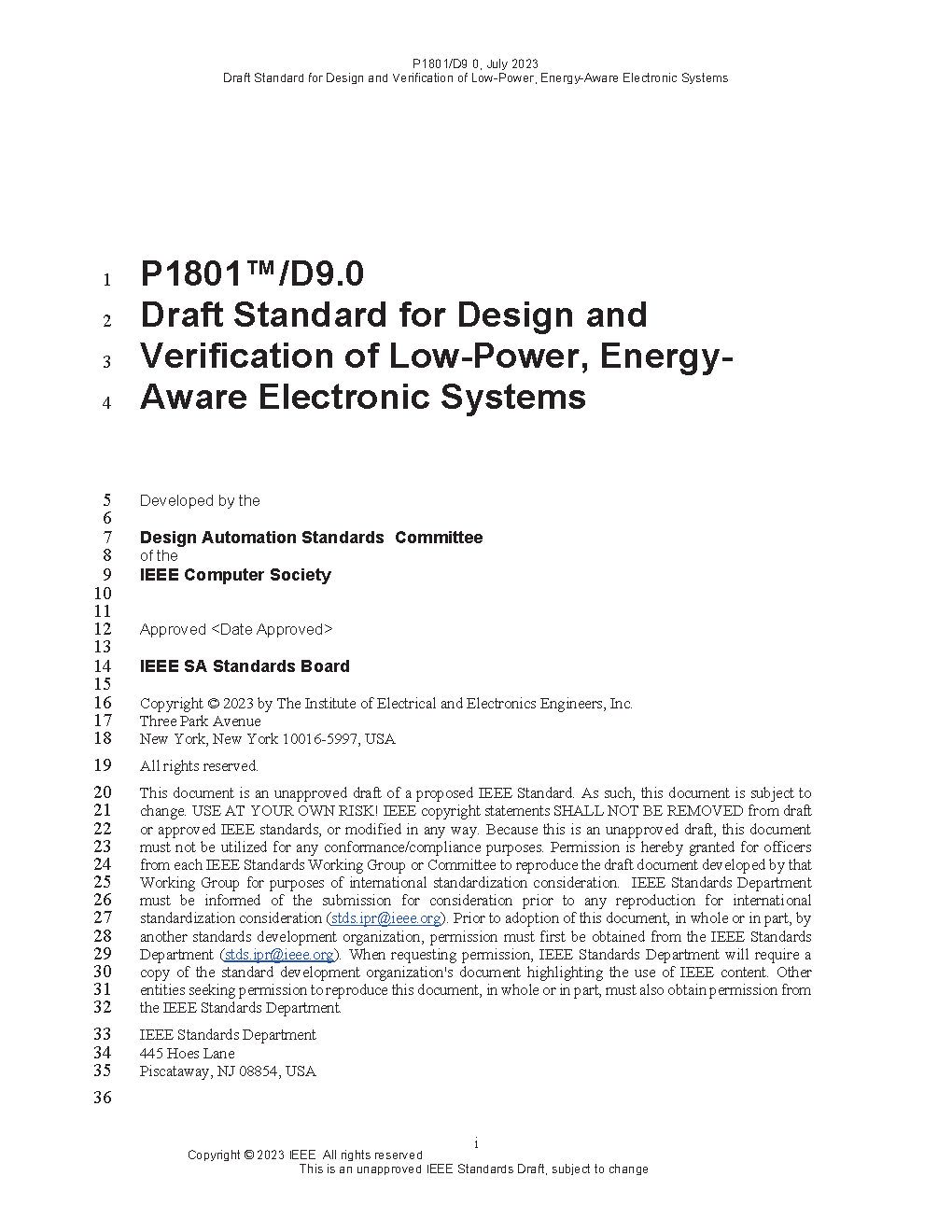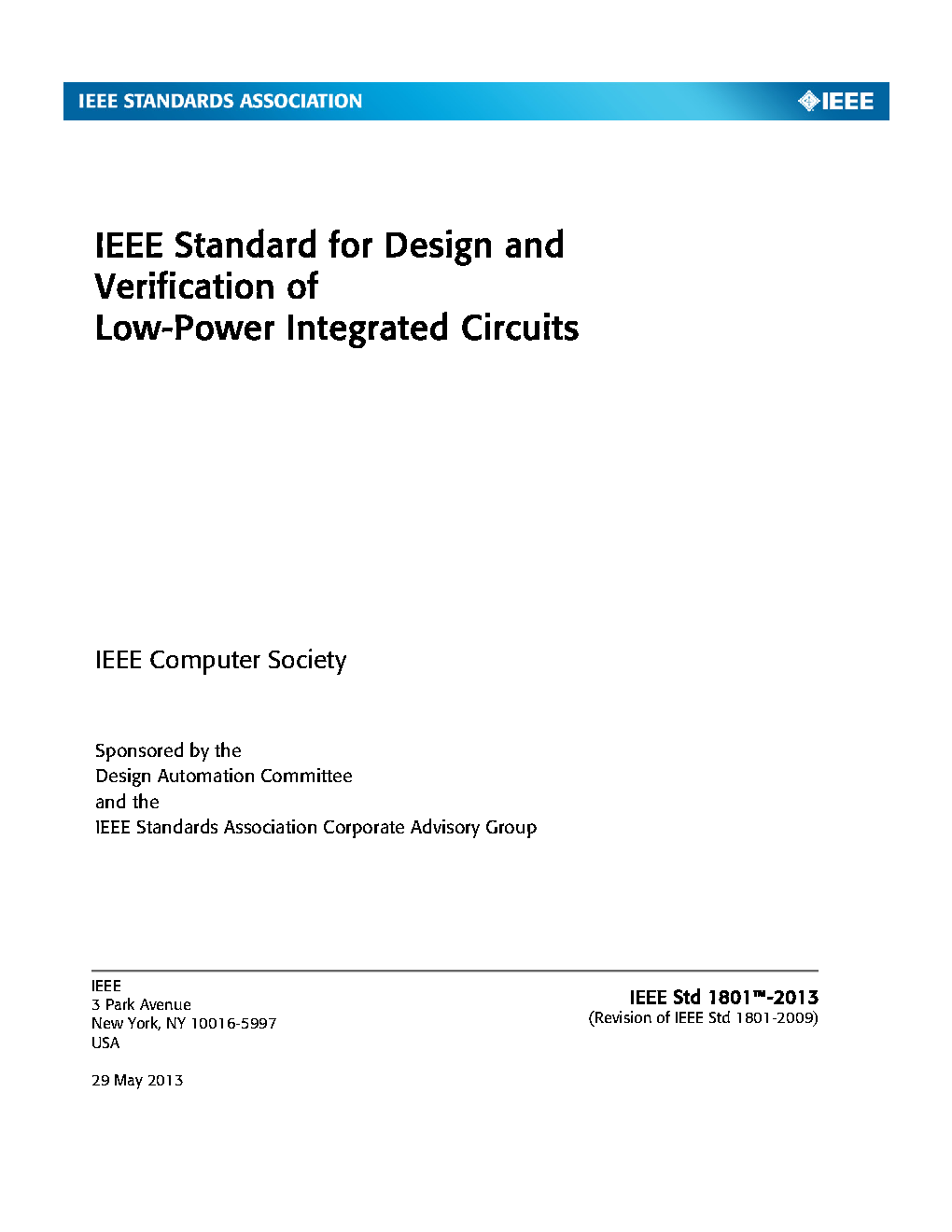 A method is provided for specifying power intent for an electronic design, for use in verification of the structure and behavior of the design in the context of a given power management architecture, and for driving implementation of that power-management architecture. The method supports incremental refinement of power intent specifications required for IP-based design flows.(The PDF of this standard is available to you at no cost thru the IEEE GET program https://ieeexplore.ieee.org/browse/standards/get-program/page)