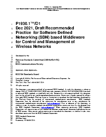 Today’s wireless networks are multi-RAT networks comprising different RATS, such as IEEE 802.11, IEEE 802.22, 3GPP, and ITU-R cellular technologies.1 These are also multivendor networks consisting of equipment from a diverse set of vendors. An SDN-based control and management framework can facilitate unified and vendor-independent control and management for these multi-RAT wireless access networks. Such a framework can also help improve the performance of the wireless networks. The purpose of this recommended practice is to define an SDN middleware along with an SDN architecture, enabling unified control and management of multi-RAT radio access networks.
