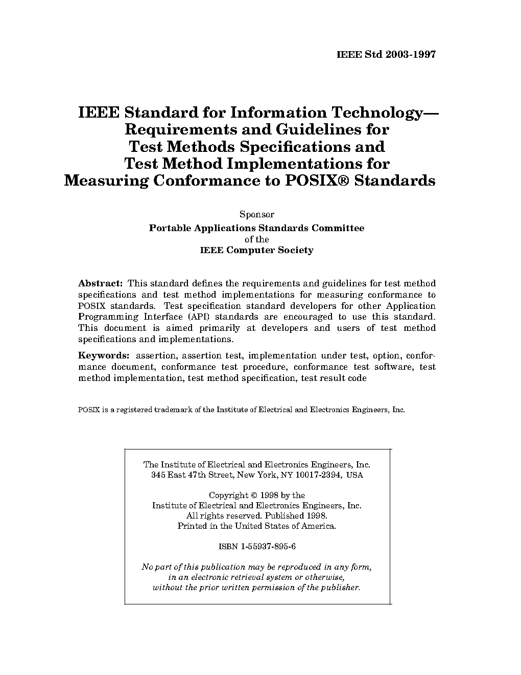 This standard defines the requirements and guidelines for test method specifications and test method implementations for measuring conformance to POSIX standards. Test specification standard developers for other Application Programming Interface (API) standards are encouraged to use this standard.This document is aimed primarily at developers and users of test method specifications and implementations.