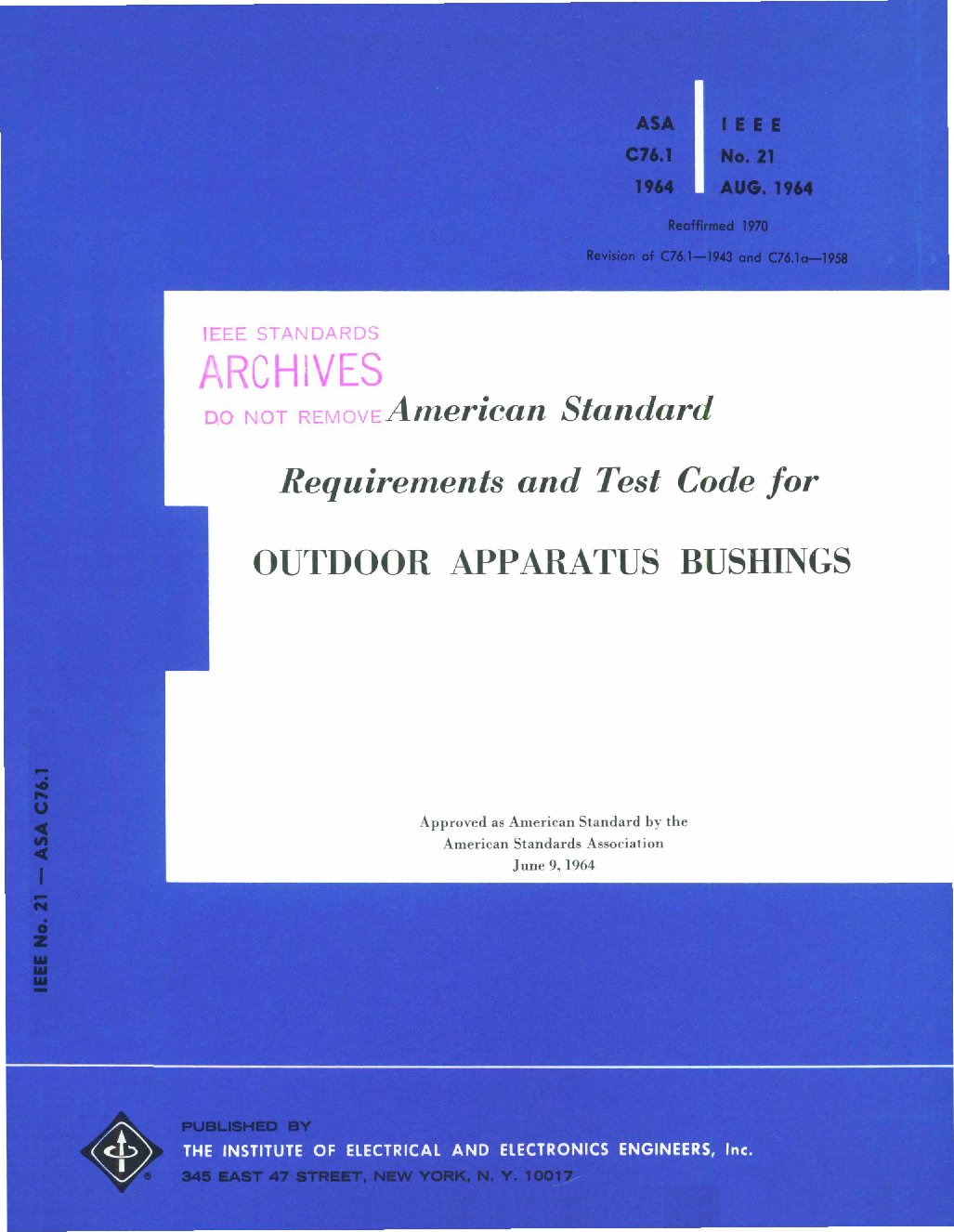 This standard applies to outdoor power class apparatus bushings which have basic impulse insulation levels of 100 kV and above for use as components of oil-filled transformers, oil-filled reactors, and oil circuit breakers.