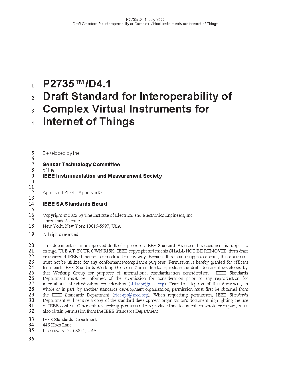 This standard provides the definitions and terminologies, reference model, and data structure of Complex Virtual Instruments (CVIs) for Internet of Things (IoT ). CVIs framework, including architectural model, protocols, and data interface requirements are also defined to allow for flexible and scalable solutions to CVIs Interoperability and easy-to-implement cloud services that are able to be maintained in a sustainable manner.