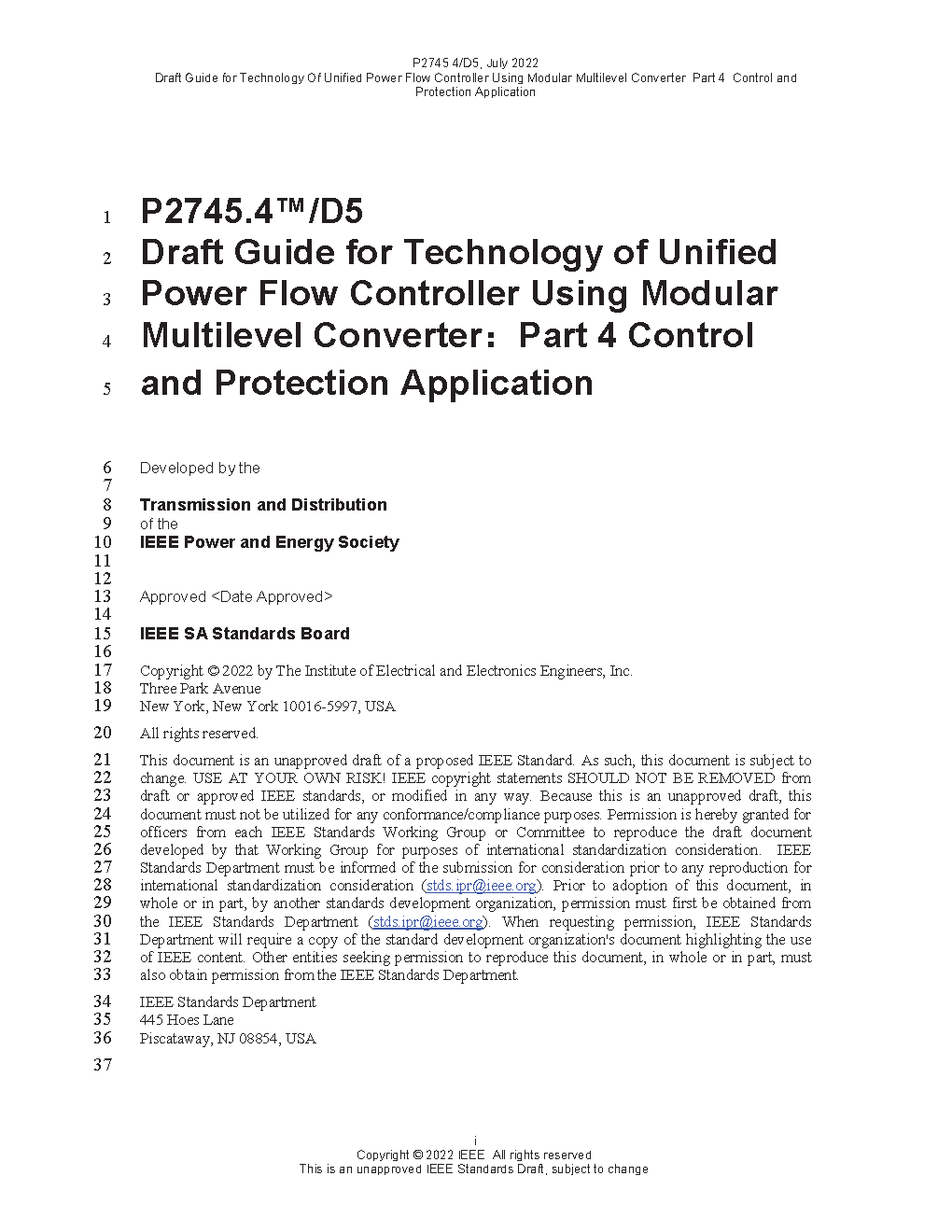 This guide specifies the application of control and protection on a unified power flow controller (UPFC) using a modular multilevel converter (MMC) in transmission lines, including application considerations, protection functions and performance, control strategies, and monitoring functions, as well as test and commissioning approaches. The guide also provides informative case studies of control and protection systems based on the application experience of UPFC projects.