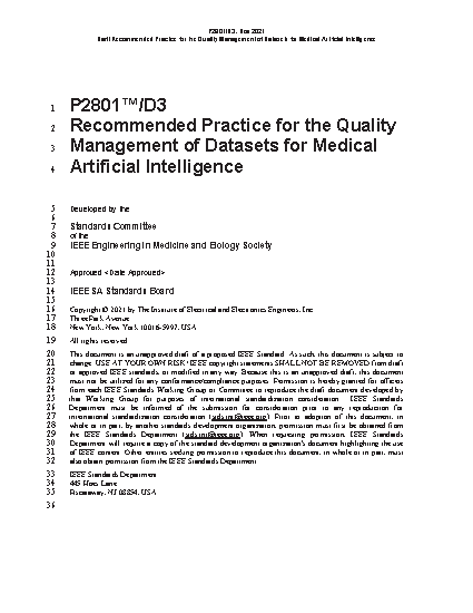 This recommended practice identifies best practices for establishing a quality management system for data sets used for artificial intelligence in medical devices. It covers a full cycle of data set management, including items, such as but not limited to, data collection, transfer, utilization, storage, maintenance, and updates. The recommended practice recommends a list of critical factors that impact the quality of data sets, such as but not limited to, data sources, data quality, annotation, privacy protection, personnel qualification/training/ evaluation, tools, equipment, environment, process control, and documentation.