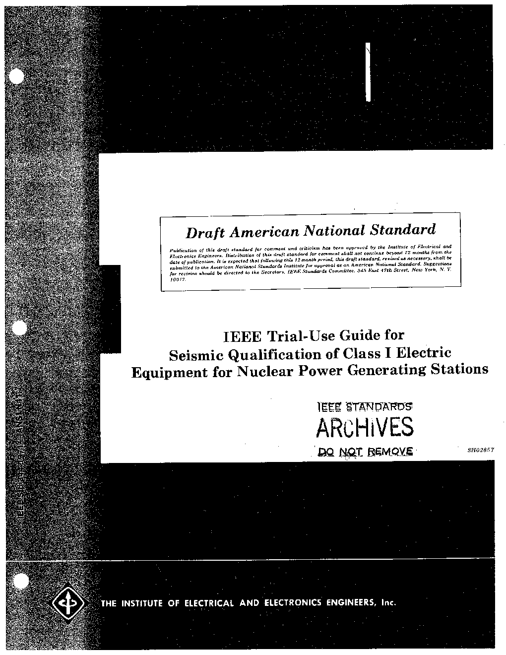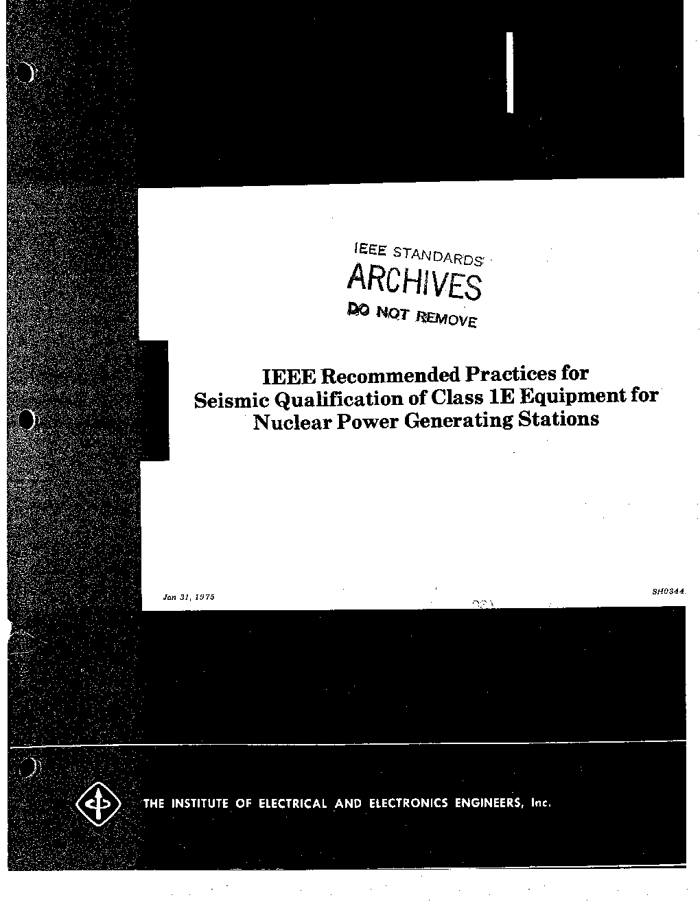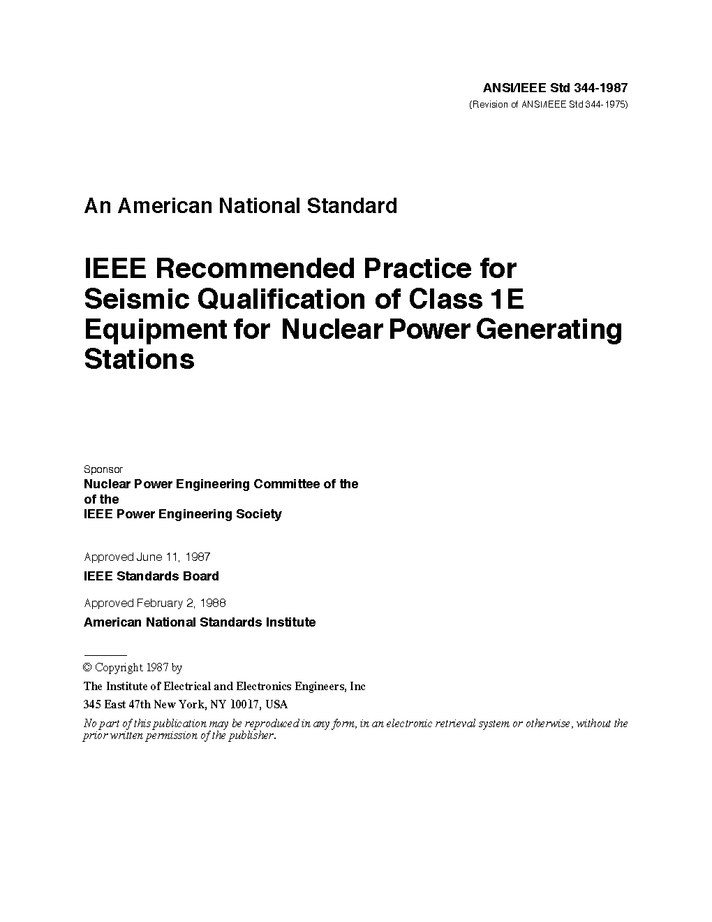 These recommended practices provide direction for establishing procedures that will yield data which verify that the class 1E equipment can meet its performance requirements during and following on SSE (safe shutdown earthquake) preceded by a number of OBEs (operating basis earthquakes). This document maybe used by equipment manufactures to establish procedures that will yield data to substantiate performance claims or by equipment users to evaluate and verify performance of representative devices and assemblies as part of an overall qualification effort.
