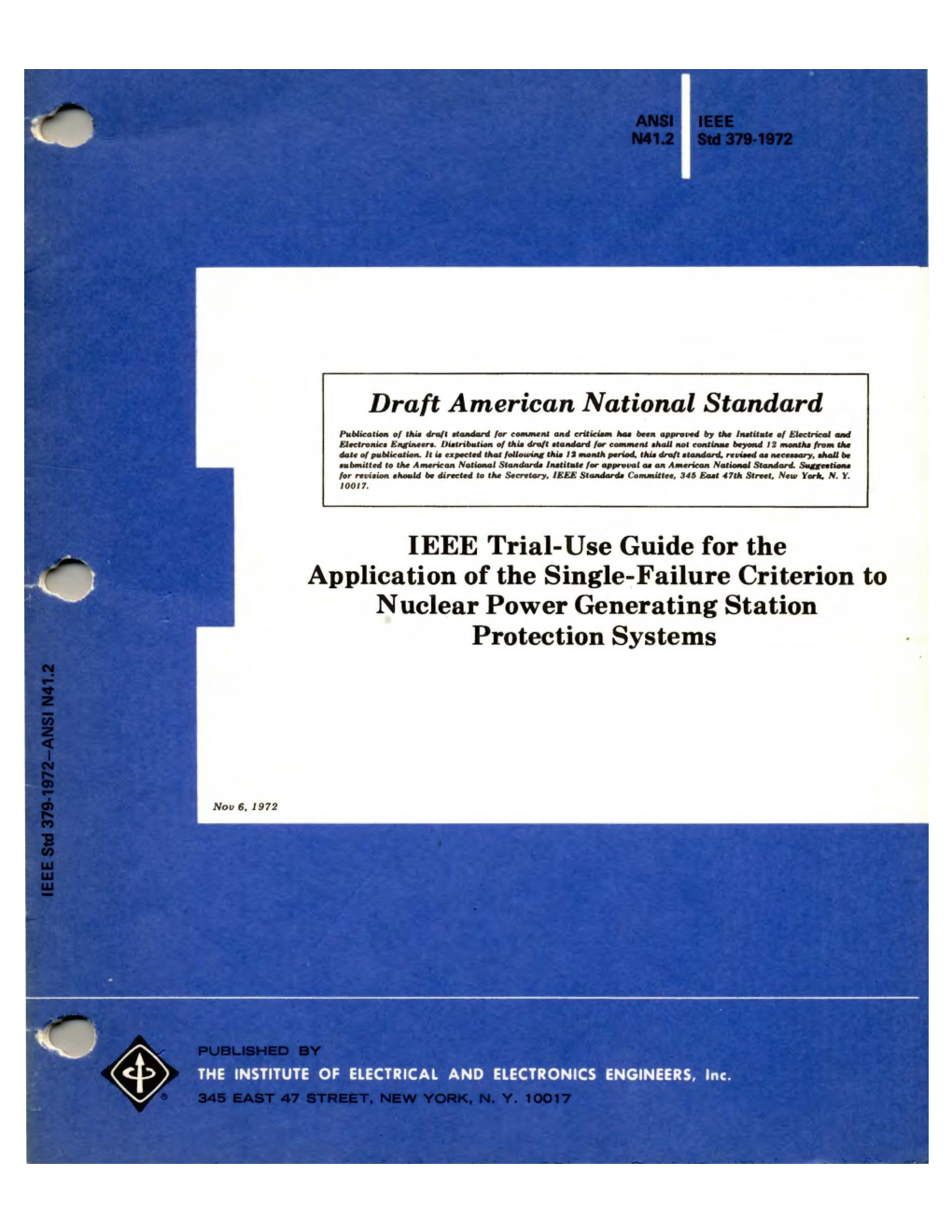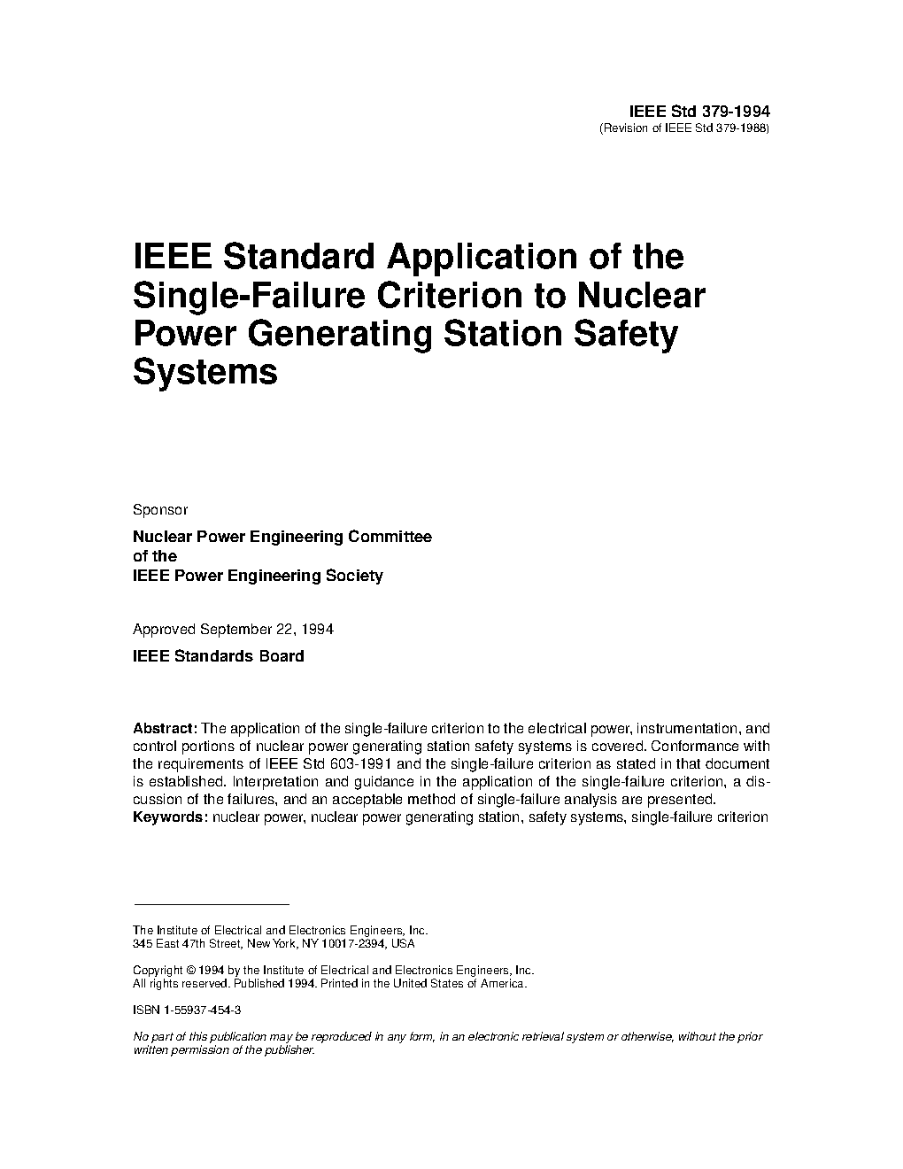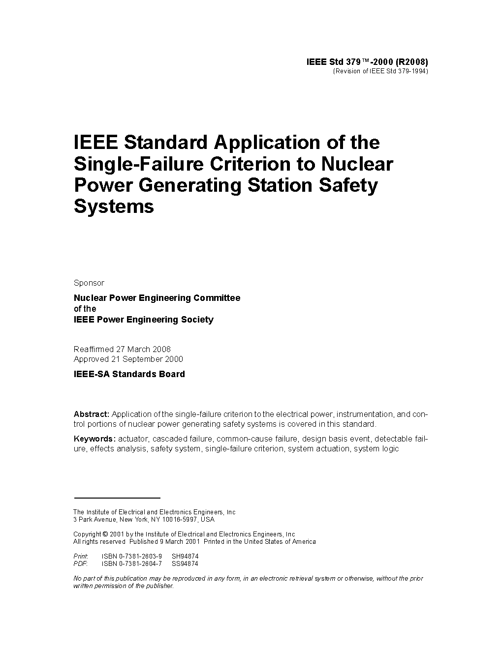 Requirements for the application of the single-failure criterion to the electrical power, instrumentation, and control portions of nuclear power generating safety systems are provided in this standard.