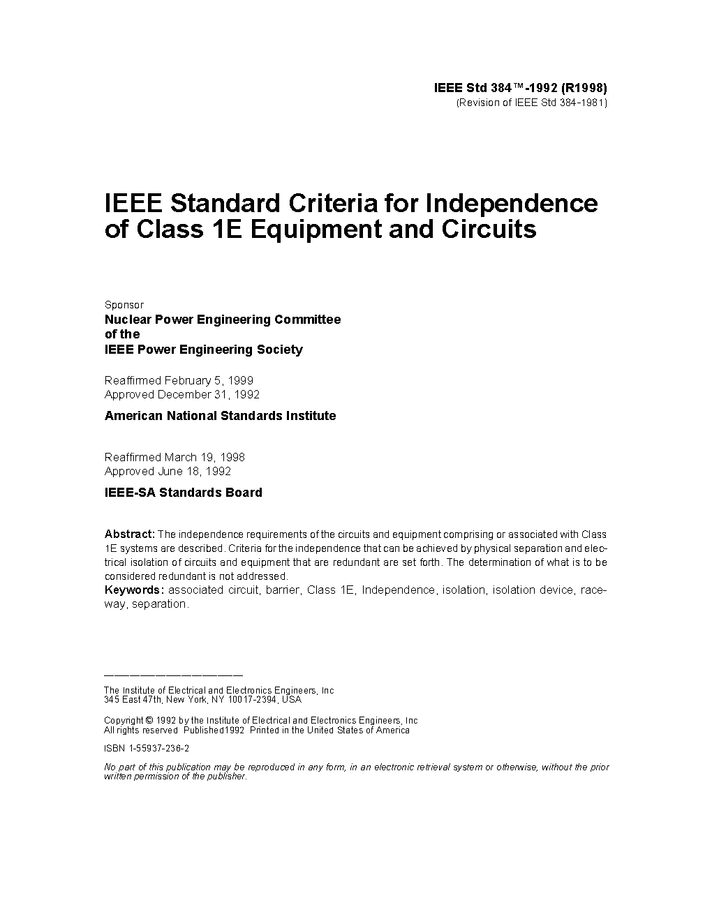 This standard establishes the criteria for implementation of the independence requirements of IEEE Std 308™ 1 and IEEE Std 603™.
