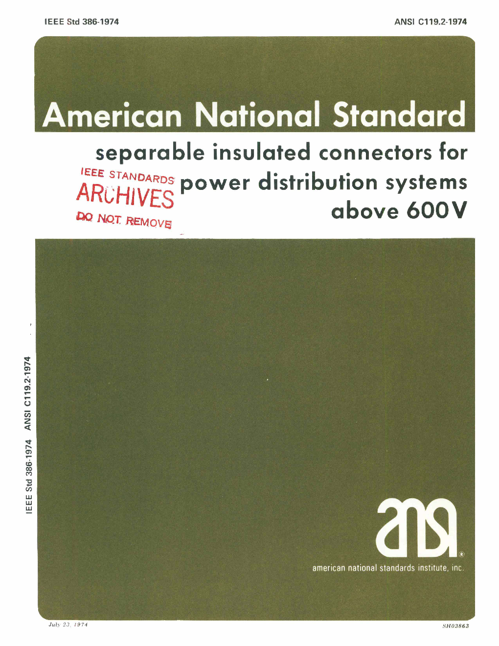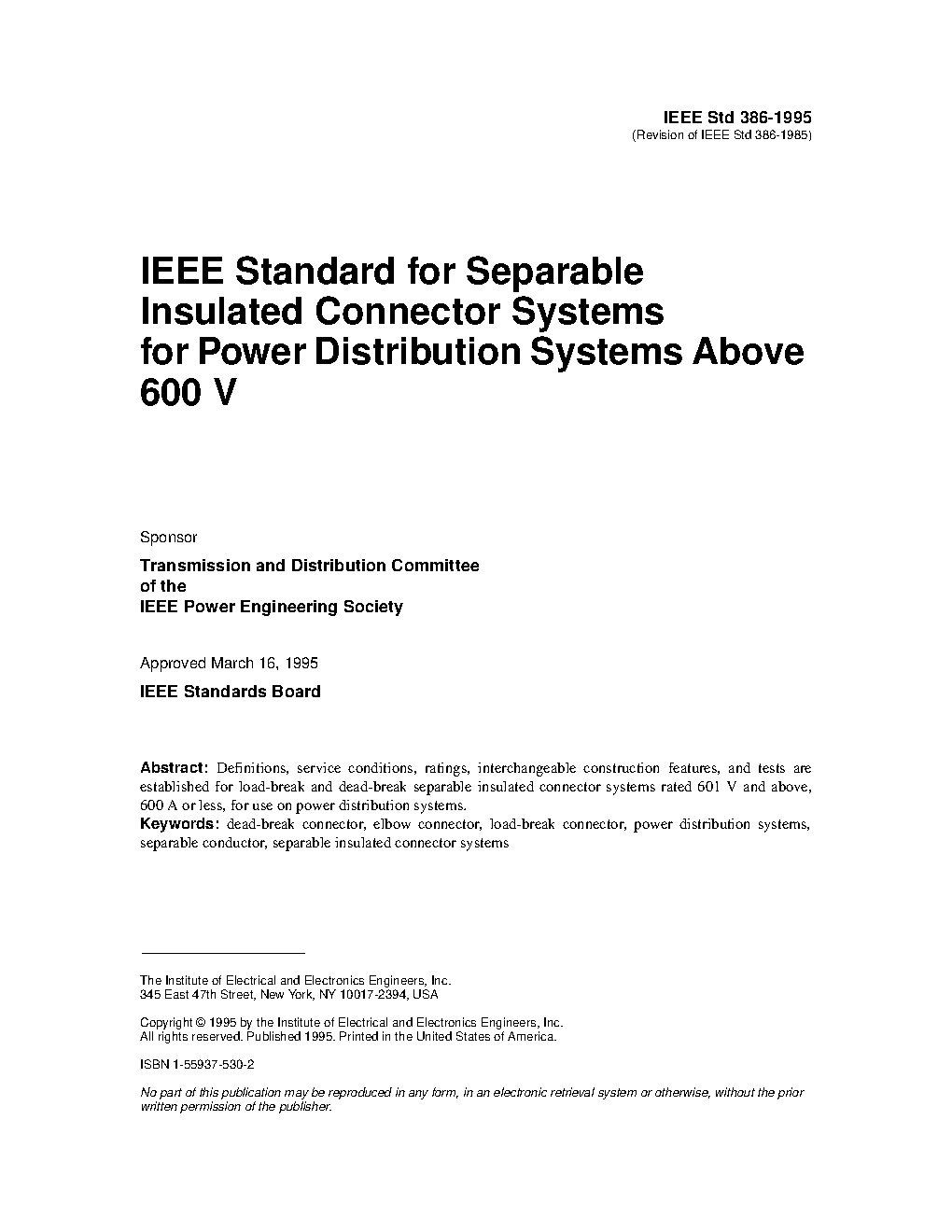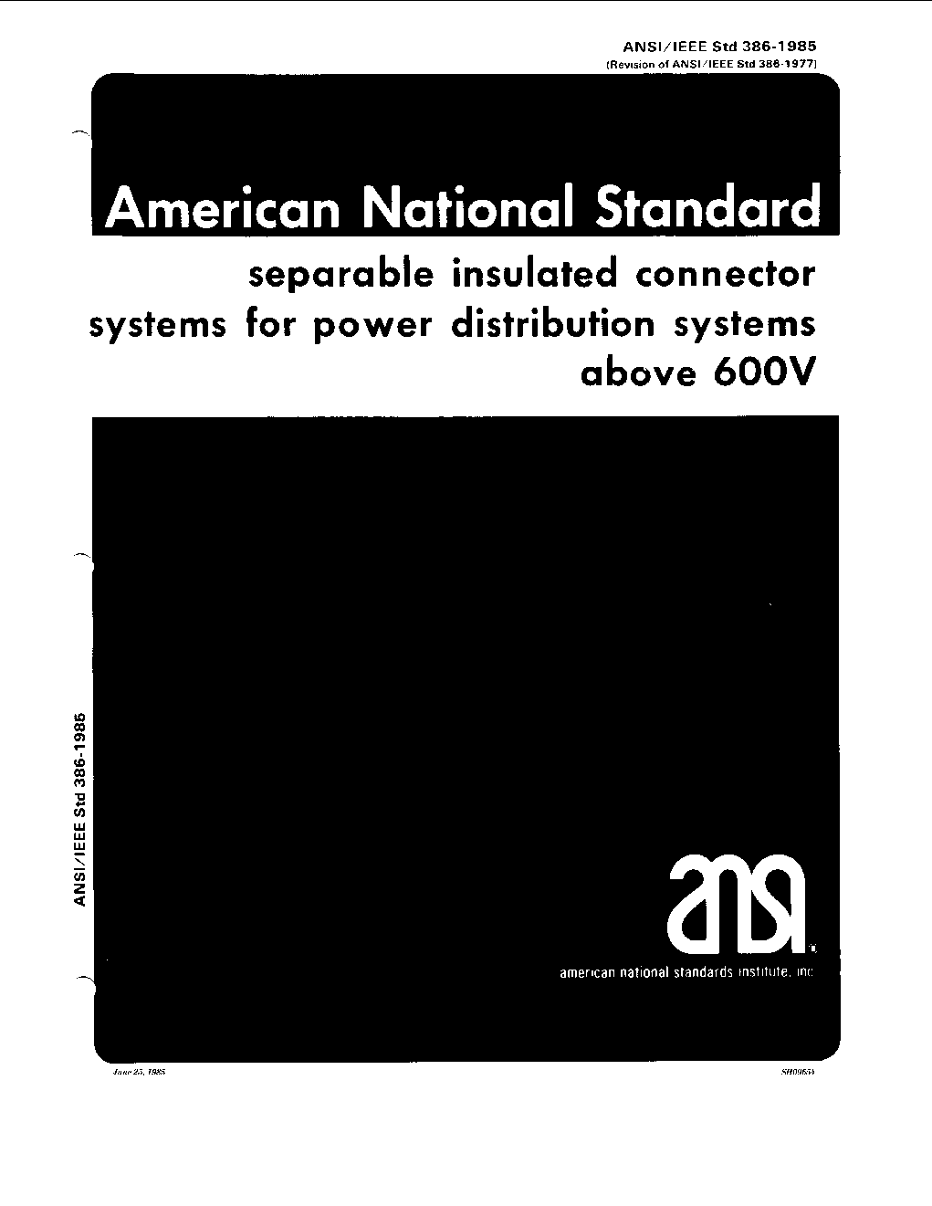 Definitions, service conditions, ratings, interchangeable construction features, and tests are established for loadbreak and deadbreak separable insulated connector systems for use on power distribution systems rated 2.5 kV through 35 kV and 900 A or less.