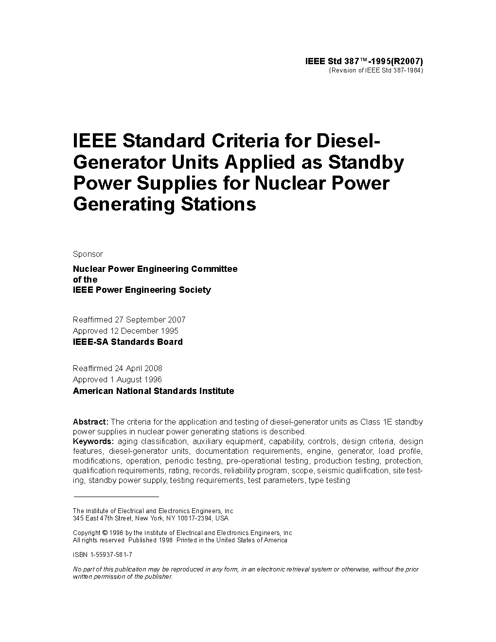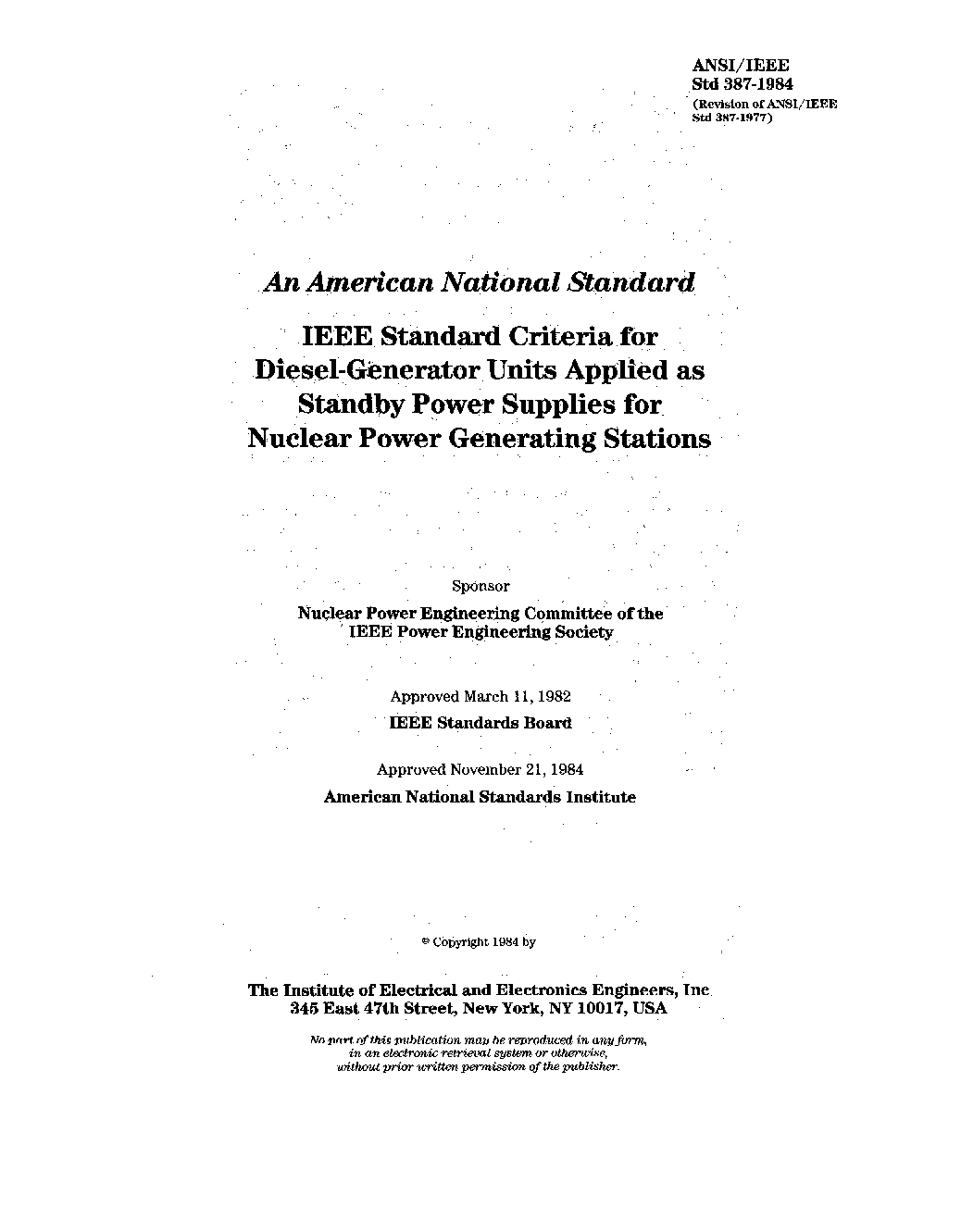 This standard defines the criteria for the application and testing of diesel-generator units used as Class 1E standby power supplies in nuclear power generating stations. Figure 1 shows the boundaries of systems and equipment included in the scope of this standard.