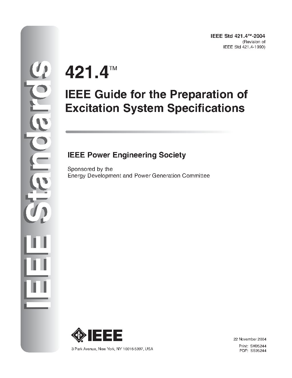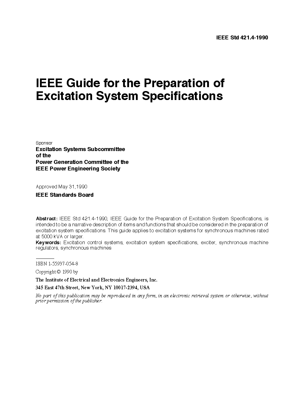 Replaced by 421.1-2004 (SH/SS95244) Abstract: IEEE Std 421.4-1990, IEEE Guide for the Preparation of Excitation System specifications, is intended to be a narrative description of items and functions that should be considered in the preparation of excitation system specifications. This guide applies to excitation systems for synchronous machines rated at 5000 kVA or larger.