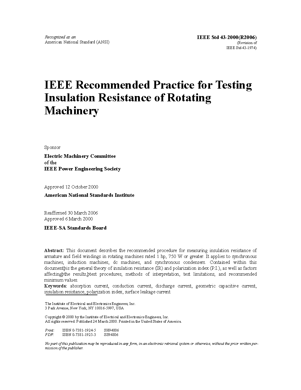 The purpose of this publication is to:1) Describe and define insulation resistance as applied to the winding of a rotating machine; 2) Review the factors which affect or change insulation resistance characteristics and recommend uniform test conditions; 3) Outline and recommend uniform methods for measuring insulation resistance together with precautions for avoiding erroneous results; 4) Provide a basis for interpreting insulation resistance test results to estimate the suitability of the winding for service or for overpotential test.; 5) Present equations, based on machine ratings, for the calculation of recommended minimum insulation resistance values for various types of rotating machines.