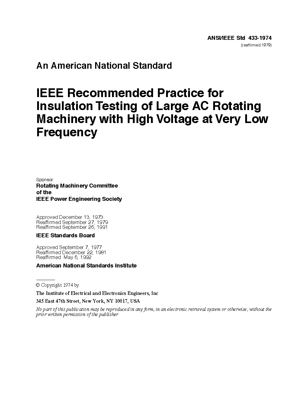 Described in this recommended practice are very low frequency withstand and diagnostic tests that are performed on the stator windings of ac electric machines.