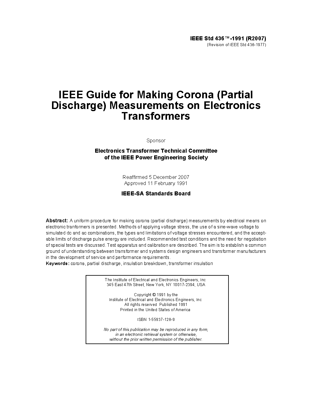 This guide covers the detection of corona (partial discharge) and the measurement of its magnitude in electronics transformers. Test conditions, test apparatus, and test requirements are included.